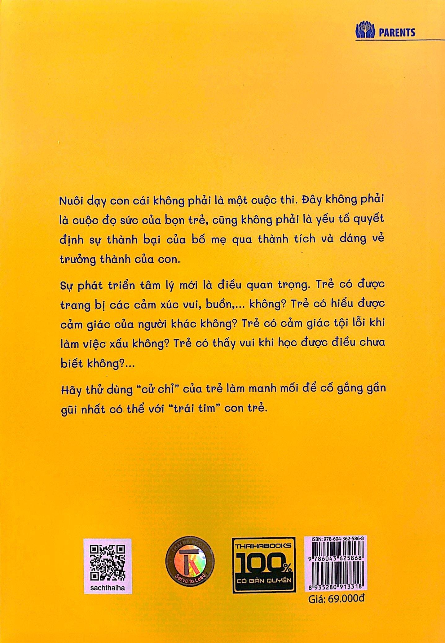 “Cử chỉ” không chỉ là biểu cảm trên gương mặt, mà còn bao gồm toàn bộ hành động của cơ thể và tay, âm sắc, ngữ điệu giọng nói,… Tuy bước vào thời kỳ nhi đồng và đến độ tuổi đủ thông thạo về ngôn ngữ nhưng suy nghĩ thật của trẻ lại được thể hiện qua “cử chỉ”. Nuôi dạy con cái không phải là một cuộc thi. Đây không phải là cuộc đọ sức của bọn trẻ, cũng không phải là yếu tố quyết định sự thành bại của bố mẹ qua thành tích và dáng vẻ trưởng thành của con. Sự phát triển tâm lý mới là điều quan trọng. Trẻ có được trang bị các cảm xúc vui, buồn,… không? Trẻ có hiểu được cảm giác của người khác không? Trẻ có cảm giác tội lỗi khi làm việc xấu không? Trẻ có thấy vui khi học được điều chưa biết không?… Hãy thử dùng “cử chỉ” của trẻ làm manh mối để cố gắng gần gũi nhất có thể với “trái tim” con trẻ.