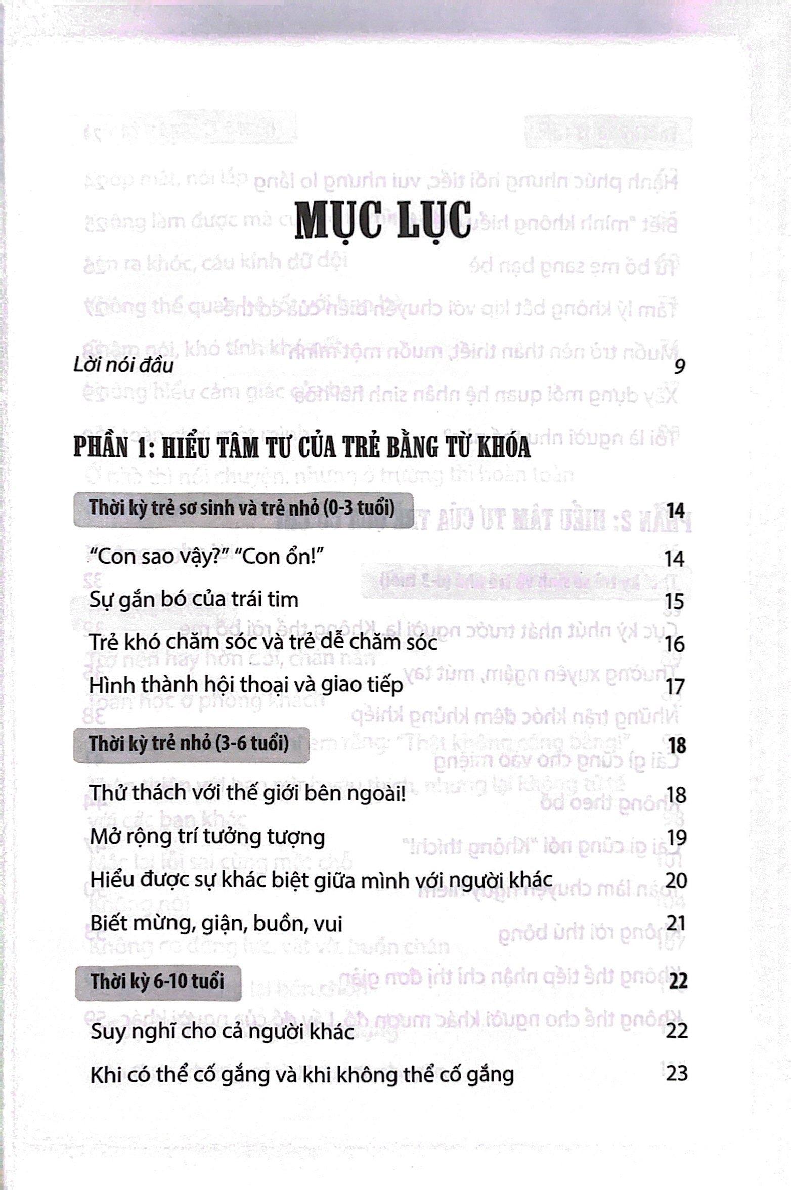 Hiểu tâm tư của trẻ qua cử chỉ gồm hai phần, hiểu tâm tư trẻ bằng từ khóa và hiểu tâm tư trẻ qua cử chỉ. Căn cứ vào những nghiên cứu tâm lý, tác giả đã rút ra những đặc điểm tâm sinh lý của trẻ ở các độ tuổi khác nhau trong khoảng từ 0-13 tuổi. Từ đó, đáp ứng được nhu cầu và có cơ sở để định hướng giáo dục trẻ. Tâm lý học phát triển là ngành khoa học lấy dòng đời con người – từ khi được thụ thai đến lúc qua đời – làm đối tượng để nghiên cứu về sự phát triển tâm lý. Trong cuốn sách này, tác giả đặt khoảng thời gian 13 năm – từ sau sinh đến khoảng thời kỳ dậy thì – làm đối tượng để giải thích bằng “từ khóa”. Mặc dù việc ghi nhớ quá nhiều thứ có vẻ tốn công sức, nhưng trước hết, nếu để tâm vào 17 từ khóa ở Phần 1, bạn có thể tích lũy nhiều trải nghiệm và thốt lên những câu như: “À, ra là vậy!”, “Thảo nào!”, “Con người thật tuyệt!”.