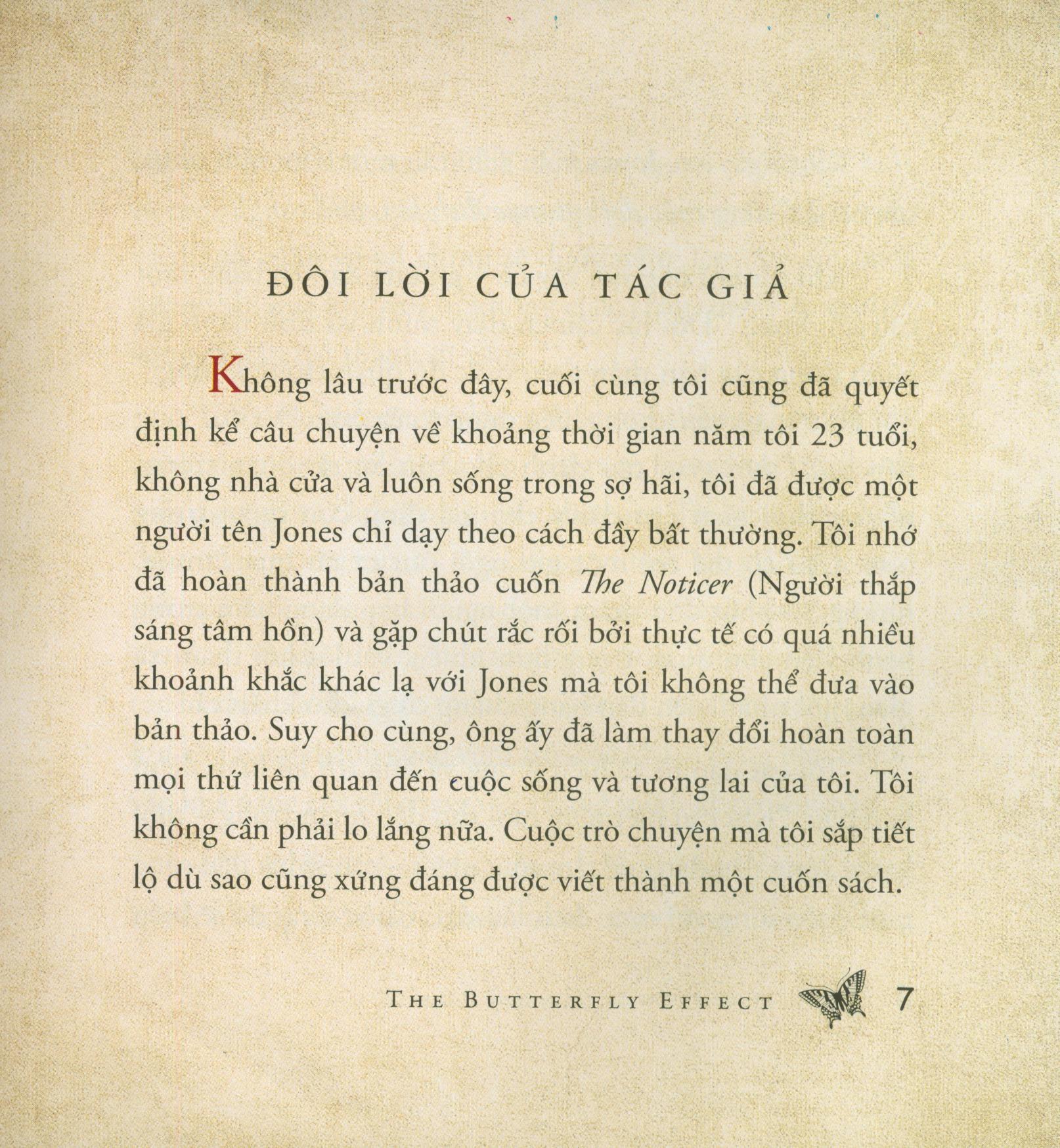Trong cuốn sách Hiệu Ứng Cánh Bướm này, Andy Andrews sẽ cung cấp cho chúng ta những ví dụ, cụ thể, sinh động cùng những lời lý giải ngắn gọn, súc tích cho hiện tượng vật lý thú vị này. Chúng ta sẽ biết rằng, chính những hành động nhỏ bé của mình sẽ là khởi nguồn của các kết quả lớn nhiều năm sau đó.