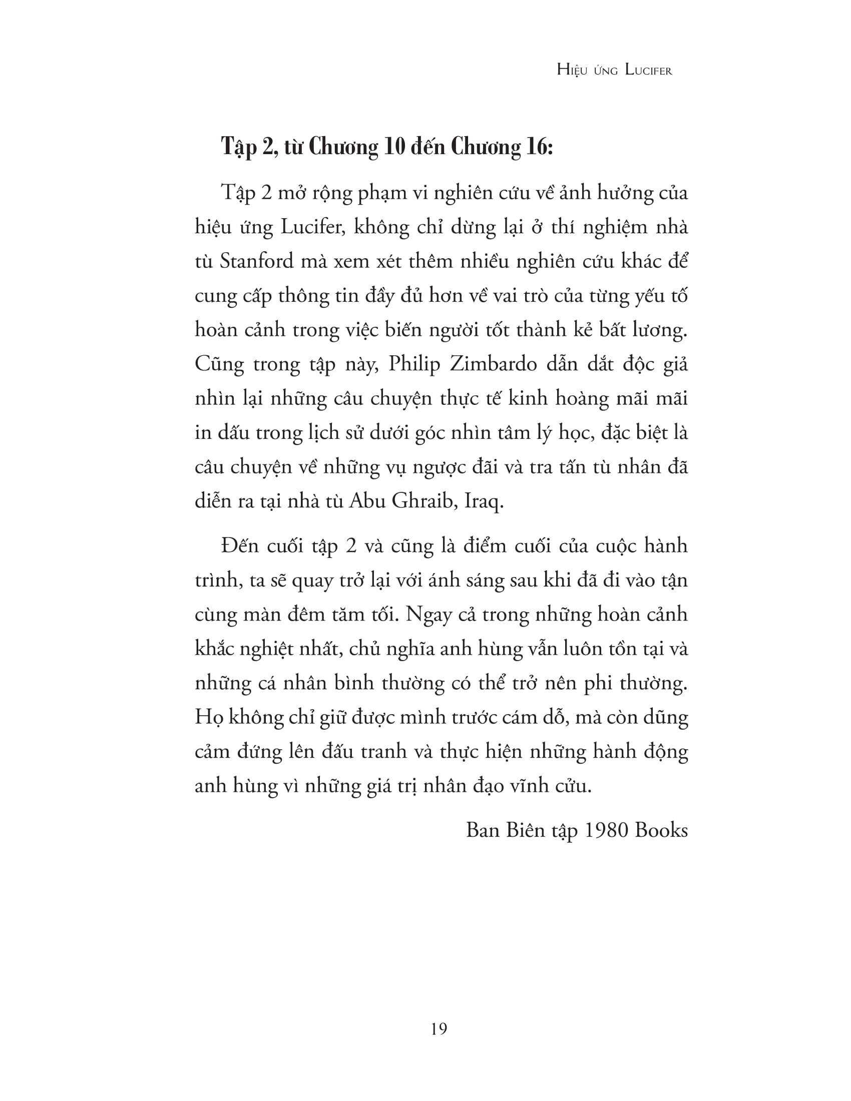 Cuốn sách khiến chúng ta phải có cái nhìn khác về bản chất của con người, rằng ranh giới thiện - ác không hề bất khả x.âm phạm và mỗi cá nhân đều có thể dễ dàng sa ngã và bị cuốn theo sự tàn độc. Nhưng bằng cách hiểu được những yếu tố tâm lý chi phối tâm trí và hành vi trong những bối cảnh cụ thể, con người hoàn toàn có khả năng rèn luyện để giữ m.ình trước những cám dỗ của cái ác và sự phi nghĩa, thậm chí có thể dũng cảm đứng lên đấu tranh, thực hiện những hành động anh hùng vì những giá trị nhân đạo vĩnh cửu.