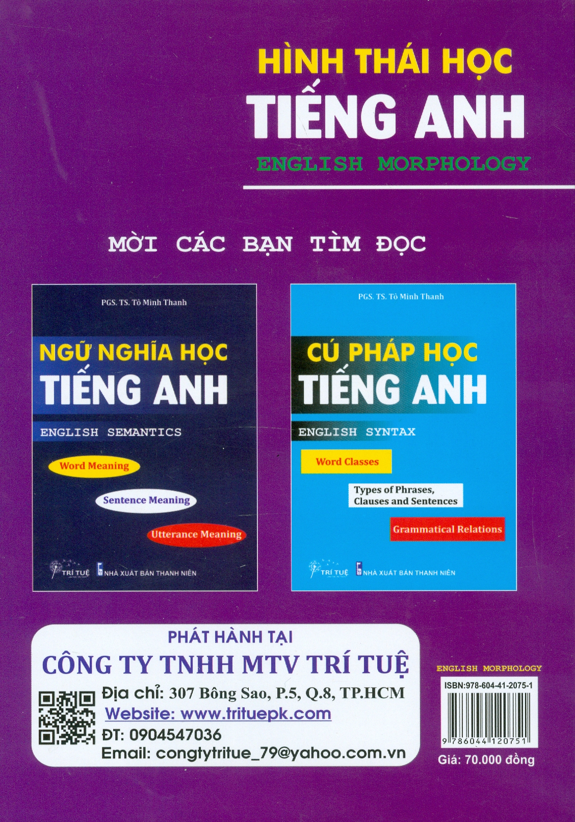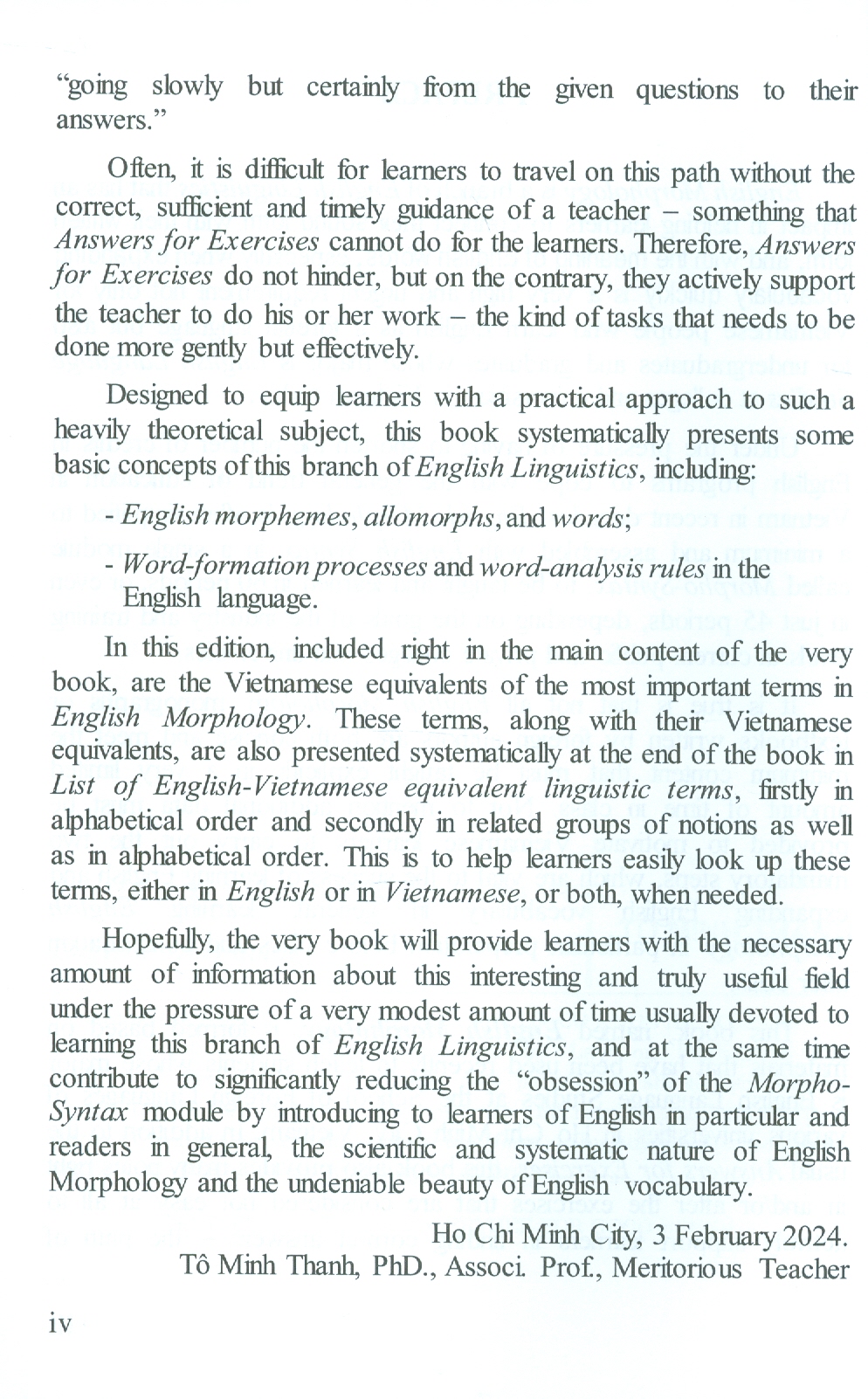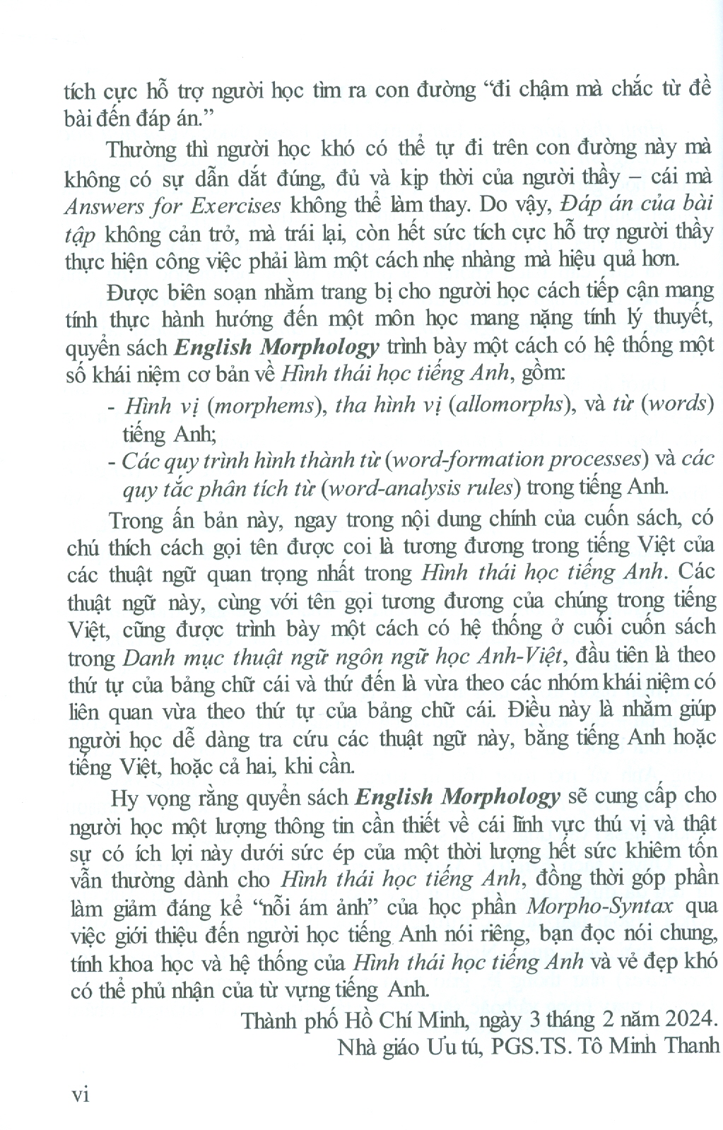 Quyển sách English Morphology được hình thành dựa trên các tư liệu đã được dùng để giảng dạy cho sinh viên chuyên ngữ Anh của Khoa Ngoại ngữ tại các trường đại học ở Thành phố Hồ Chí Minh trong thời gian qua. Ngoài Đáp án của bài tập (Answers for Exercises) như thông lệ, quyển sách này còn cung cấp nhiều ghi chú bằng cả tiếng Anh lẫn tiếng Việt ngay trong phần lý thuyết và/hoặc sau các bài tập được coi là không dễ nhằm tích cực hỗ trợ người học tìm ra con đường "đi chậm mà chắc từ đề bài đến đáp án".