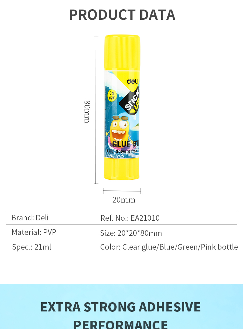 • Không chứa hóa chất độc hại, an toàn khi sử dụng • Dùng làm đồ thủ công, dán giấy, dán bao thư • Đầu dán hồ được thiết kế dạng bằng, cho hồ ra