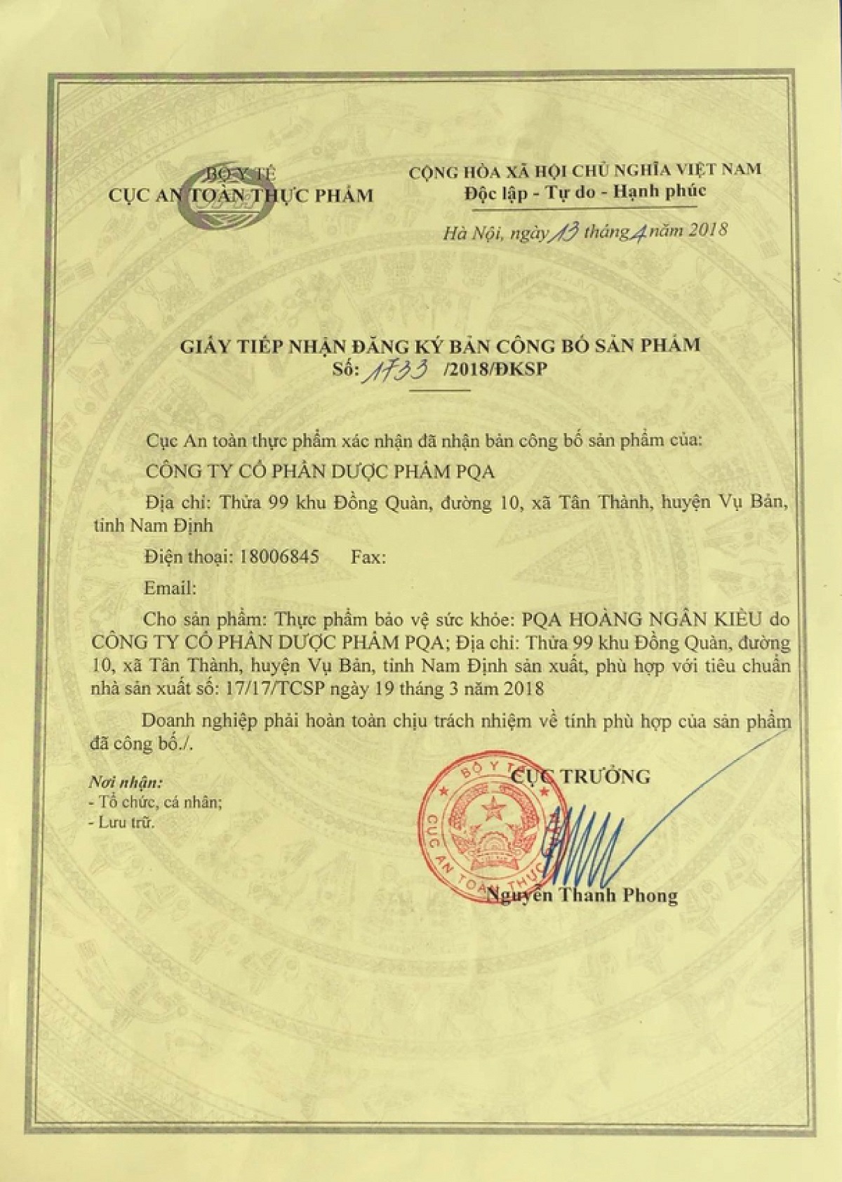 - Địa chỉ sản xuất: Công ty Cổ phần Dược phẩm PQA. Thửa 99, Khu Đồng Quàn, Xã Tân Thành, Huyện Vụ Bản, Tỉnh Nam Định. THÀNH PHẦN: