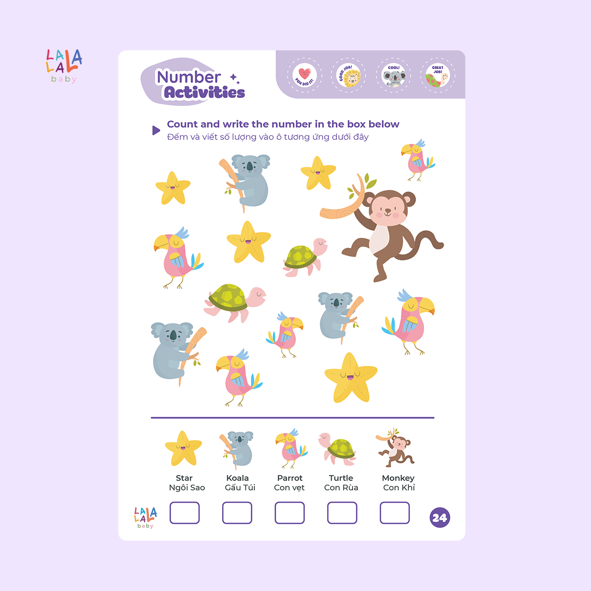 - Cuốn 3 – Stage 3: MATH ME (Toán học) Làm quen với số đếm, phép tính Hoàn thiện các số đếm, phép tính với hình ảnh minh họa sống động có phụ đề Tiếng Anh Bé lựa chọn, phân biệt, Tìm kiếm các chữ số