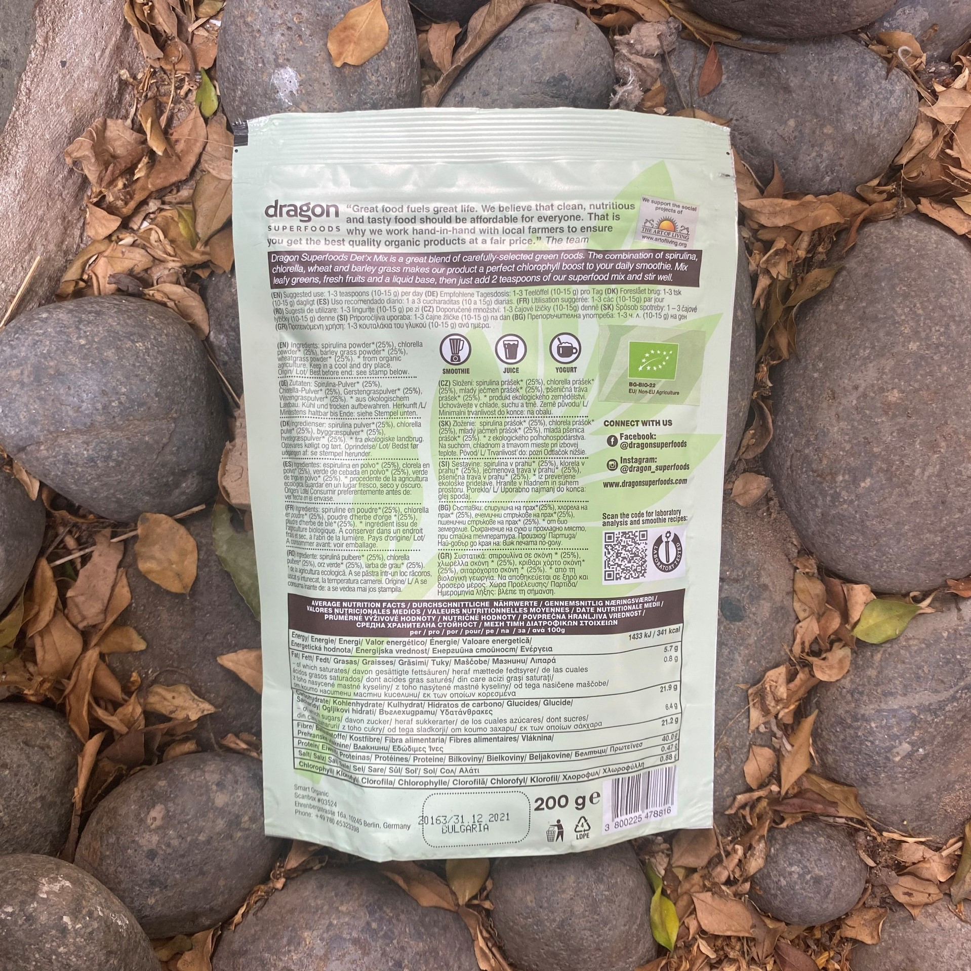 Hỗn hợp xanh Det’x của Dragon Superfoods là hỗn hợp tuyệt vời được lựa chọn từ các loại thực phẩm xanh hữu cơ một cách cẩn thận. Sự kết hợp giữa tảo xoắn, tảo lục, cỏ lúa mỳ và cỏ lúa mạch tạo nên một sản phẩm hoàn hảo cho món sinh tố hàng ngày của bạn. Trộn rau xanh, hoa quả tươi và đồ uống cơ bản, sau đó thêm 2 thìa hỗn hợp siêu thực phẩm của chúng tôi và đảo đều. GIÁ TRỊ DINH DƯỠNG TRUNG BÌNH Trên 100g Năng lượng (kJ/kcal): 320Kcal/ 1338kJ Chất béo (g): 5g Trong đó chất béo bão hòa (g): 0,6g Carbonhydrate (g): 12 Trong đó đường (g): 3 Protein (g): 41 Chất xơ (g): 32 Muối (mg): 0,4