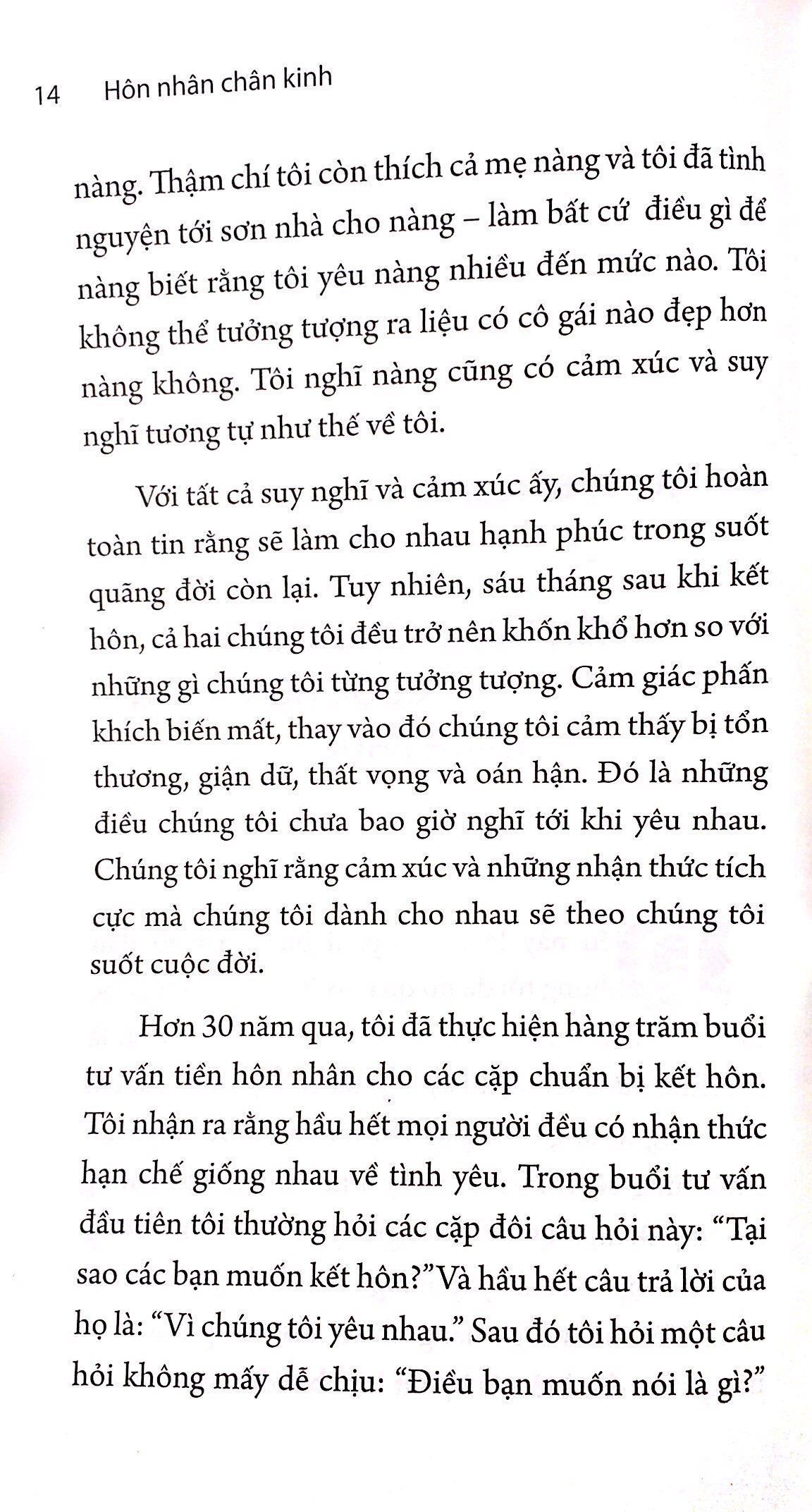 Bạn nghĩ cuộc hôn nhân của mình đã và sẽ như thế nào? Trước khi kết hôn bạn có chuẩn bị gì cho cuộc hôn nhân của mình không? Thực tế, rất nhiều cặp đôi chỉ tập trung chuẩn bị cho lễ cưới chứ không hề chuẩn bị cho hôn nhân. Lễ cưới chỉ kéo dài vài giờ, trong khi hôn nhân, chúng ta hy vọng sẽ kéo dài suốt phần đời còn lại. Tuy nhiên, bạn sẽ không thể có được một cuộc hôn nhân hạnh phúc chỉ vì bạn đã kết hôn. Hôn nhân chân kinh không phải là cuốn sách lên kế hoạch cho một đám cưới. Đây là cuốn sách lên kế hoạch để bạn có một cuộc hôn nhân hạnh phúc.