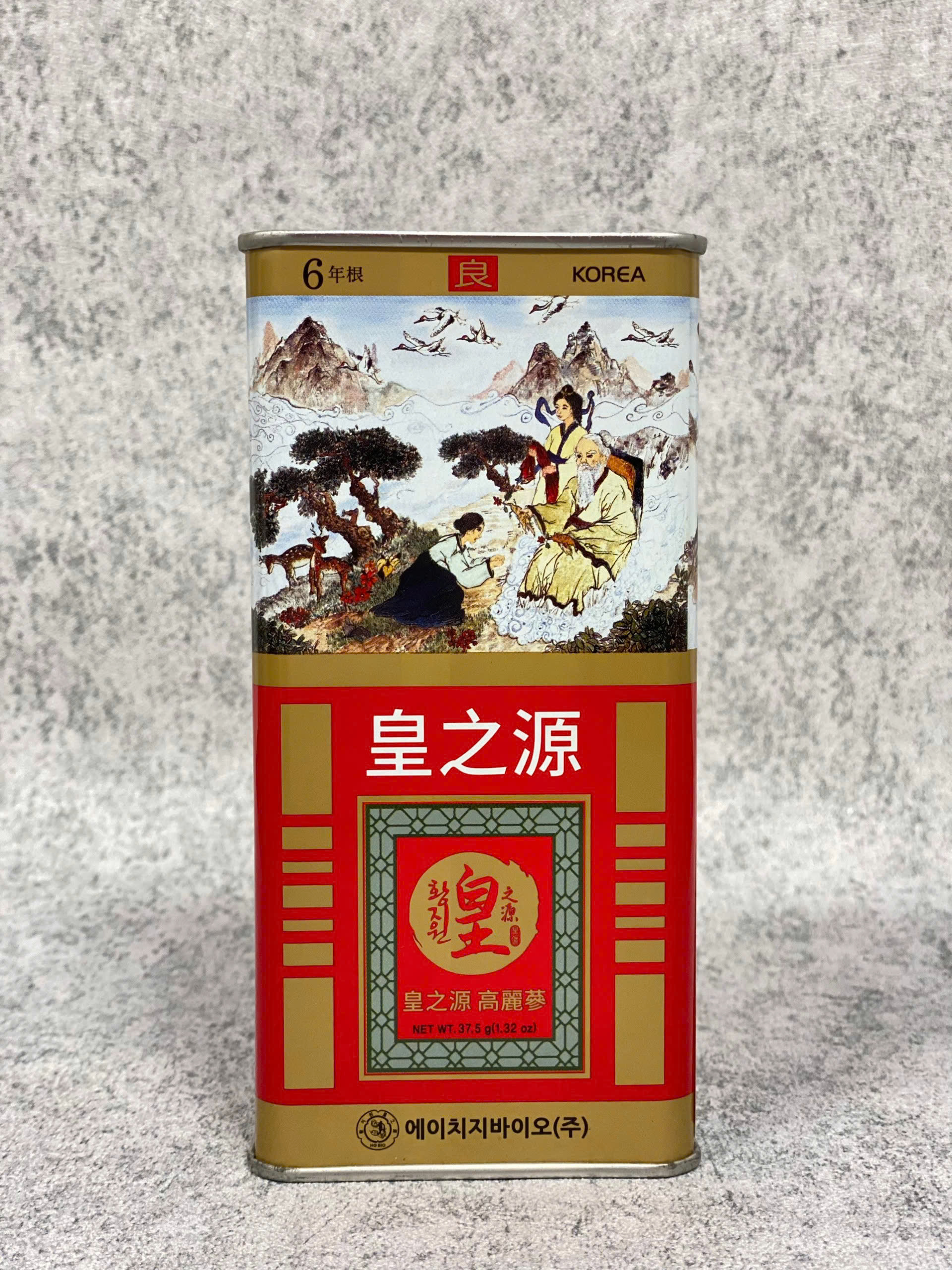 Hồng sâm củ khô hộp thiếc 37.5g Thành phần: - 100% nhân sâm Hàn Quốc qua quá trình hấp sấy thành hồng sâm củ khô nguyên chất, được sấy khô và đóng hộp gỗ bên