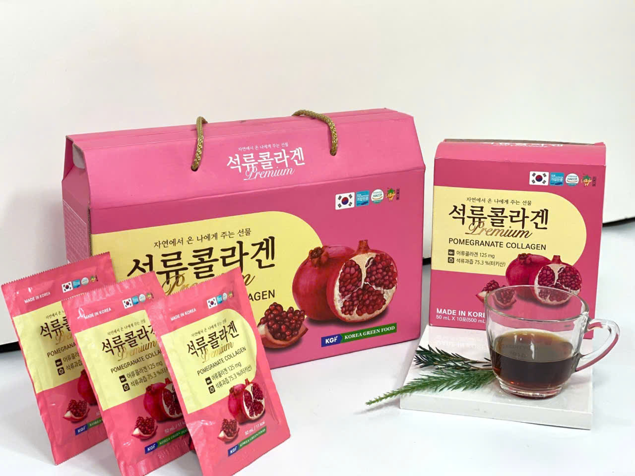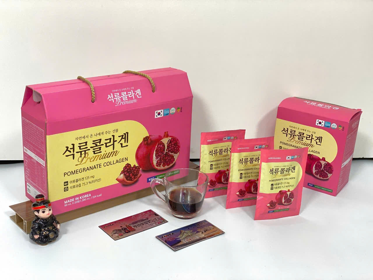 TINH CHẤT LỰU COLLAGEN - Pomegranate Collagen Premium 50 ml x 60 gói Thành phần: Nước ép lựu 75.3% (Thổ Nhĩ Kỳ, hàm lượng chất rắn 12%), collagen 125 mg, chiết xuất hỗn hợp thảo