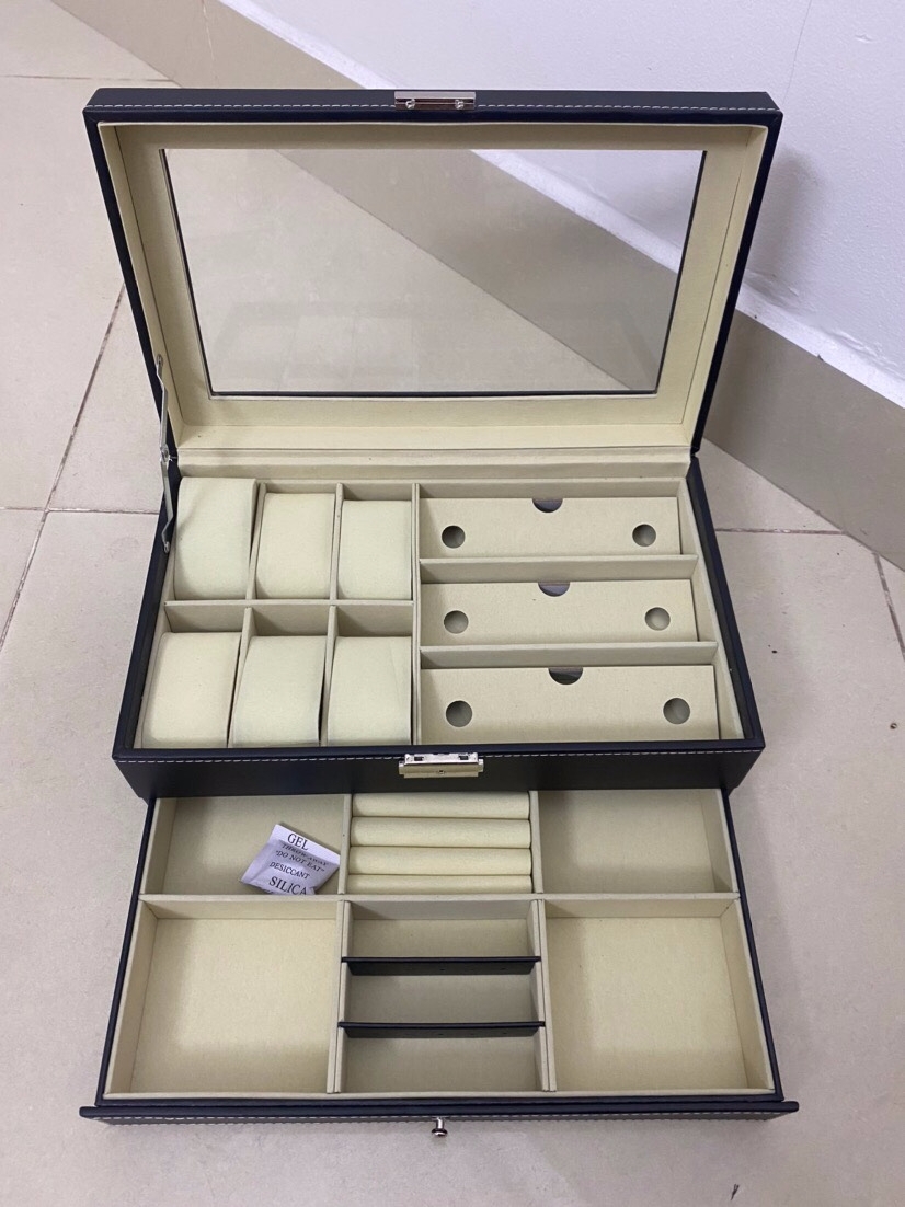 Hộp thiết kế 2 tầng: tầng trên đựng 6 chiếc đồng hồ và 3 mắt kính, tầng dưới đựng trang sức