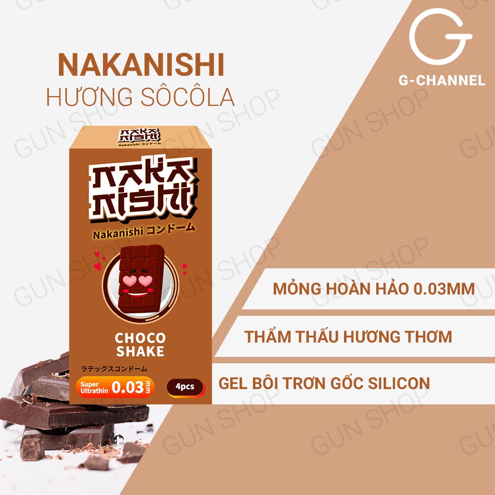 ✪ Thông tin: Nếu bạn đã quá quen thuộc với những mùi vị hoa quả tươi mát như cam, dâu, đào,.. vậy tại sao lại không thử tìm đến một sự lựa chọn khác lạ như chocolate để thay đổi hương vị cuộc “yêu” với bạn tình của mình? Bao cao su Nakanishi hương chocolate sẽ là một làn gió mới đem đến trải nghiệm mới lạ cho bạn và người ấy khi ái ân đấy. Sản phẩm mang đến cho các cặp đôi trải nghiệm chân thực, thoải mái và hưng phấn nhất khi “ái ân” nhờ độ mỏng chỉ 0.03mm và khả năng truyền nhiệt siêu nhanh, thiết kế ôm sát, chống tuột giúp bạn tự do chuyển động, biến đổi tư thế và tự tin thể hiện bản lĩnh với bạn tình của mình.