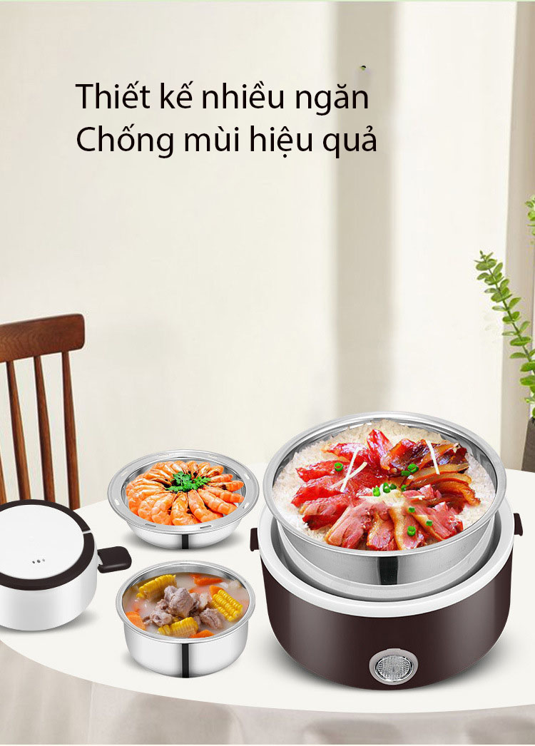Mua tại Tiktok- Tên sản phẩm: Hộp cơm cắm điện 3 tầng - Chất liệu vỏ: Nhựa PP, có khả năng chịu nhiệt tốt và an toàn ( KHÔNG CHỨA CHẤT GÂY UNG THƯ) - Chất liệu ruột: Chất liệu inox 304, an toàn và sạch sẽ. - Công suất: 200W - Điện áp: 220 V, 50 Hz - Dung tích 2.0 lít - Số ngăn: 3 ngăn - Có màu hồng, đen, nâu màu và nắp, tuỳ vào từng lô hàng khác nhau tuy nhiên ac yên tâm chất lượng hoàn toàn như nhau nên shop sẽ gửi hàng theo lô về hiện có khách chọn vui lòng note vào đơn hoặc shop gửi ngẫu nhiên - Có chức năng nấu, hâm nóng và hấp thức ăn. - Kích thước: Rộng 15cm, cao 20cm. - Thời gian hâm nóng siêu nhanh: 5 -15 phút - Tiện dụng cho dân văn phòng, cắm trại, đi du lịch. - Nhỏ gọn và tiện lợi. HƯỚNG DẪN CÁCH SỬ DỤNG - B1: Chúng ta sẽ đong khoảng 2 cốc nước và đổ vào phần đáy dưới của nồi (phần đáy nhựa dưới cùng) - B2: Cho thức ăn và cơm vào các ngăn trên. - B3: Cắm điện cho nồi và tiến hành nấu bình thường. - Thời gian nấu cơm nhanh: mất khoảng 30 - 35 phút. - Nồi dùng hơi nước để trực tiếp làm chín cơm và thức ăn. - Nồi có chức năng nấu, hâm nóng, hấp trứng và thức ăn khác. - Nồi sử dụng nút nhấn nhả, và có chức năng tự động ngắt điện khi hết nước ở ngăn dưới cùng. - Các bạn nhấn vào đèn 1 lần đèn sáng, nhấn lần tiếp theo đèn tắt.