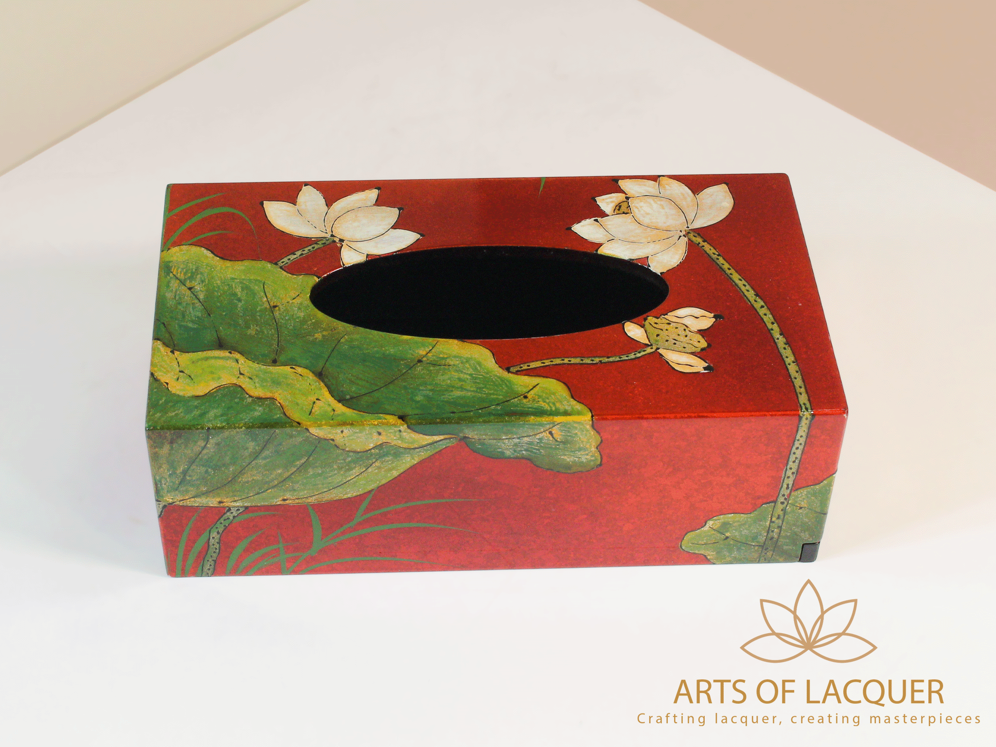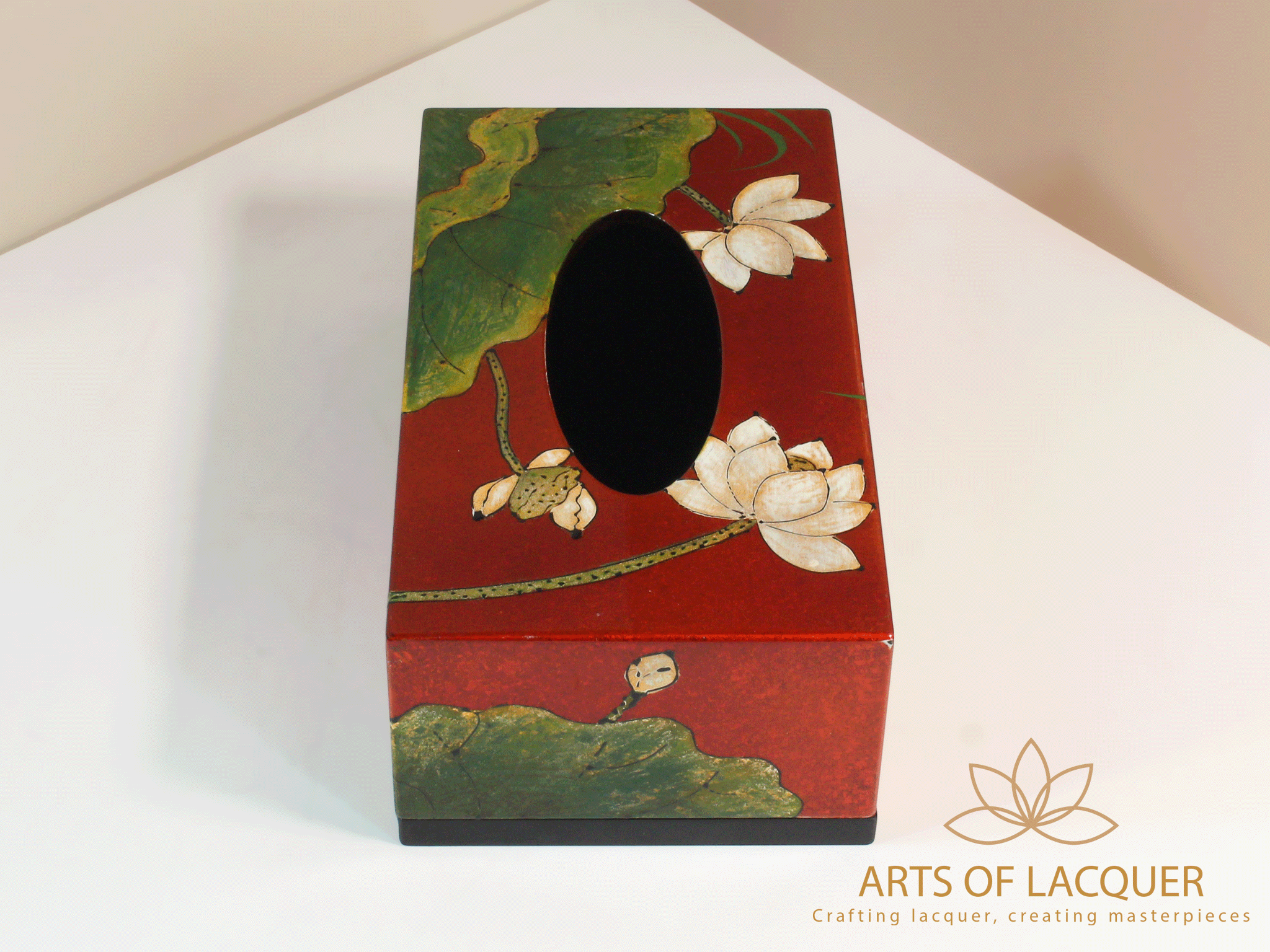 Mua tại TiktokHộp đựng khăn giấy trong hình là "Hộp Đựng Khăn Giấy Sơn Mài Hoa Sen" từ Arts of Lacquer. Hộp có nền màu đỏ với họa tiết lá sen và hoa sen trắng tinh tế. Chất liệu là gỗ sơn mài, đảm bảo độ bền và khả năng chống nước.
