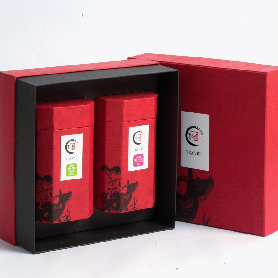 "Kích thước 20 cm x 20 cm x 9 cm, chất liệu giấy gân mỹ thuật màu đỏ, mặt trên in hoa văn Mục đồng thổi sáo, dán logo Trà Việt bằng giấy couche, bên trong đệm giấy mỹ thuật đen, có 2 hộp trà bát giác màu đỏ. Sự kết hợp độc đáo của Trà Shan Trấn Ninh và những búp hoa lài hàm tiếu hái vào tầm trưa nắng nỏ, tạo ra một loại trà lài với hương thơm dịu nhẹ, nồng nàn. Trà Lài có màu nước vàng, hương lài thơm ngát, vị chát vừa, có tác dụng chống lão hóa, ngăn ngừa các bệnh về tim mạch, đường ruột, dạ dày… Trà Sen Bảo Lộc dùng giống trà Shan Trấn Ninh, lá trà to, cánh trà mềm, xốp, thấm hương tốt. Trà được trồng ở độ cao từ 900 – 1.100m so với mực nước biển, với nhiệt độ từ 17 – 25oC.Trà Sen có màu nước vàng, hương thơm ngát, vị chát vừa."