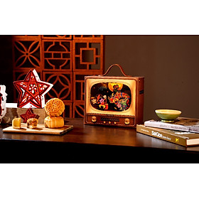 'Hộp quà "Truyền Hình Tí Hon – Múa Lân" tái hiện sinh động khung cảnh múa lân truyền thống dưới ánh trăng rằm. Ông Địa tay cầm quạt mo cùng đoàn lân rực rỡ sắc màu nhảy múa tưng bừng, tiếng trống rộn ràng và nhóm trẻ con tung tăng rước đèn tạo nên bức tranh Trung Thu tuổi thơ vui vẻ, ấm áp, tràn ngập tiếng cười.