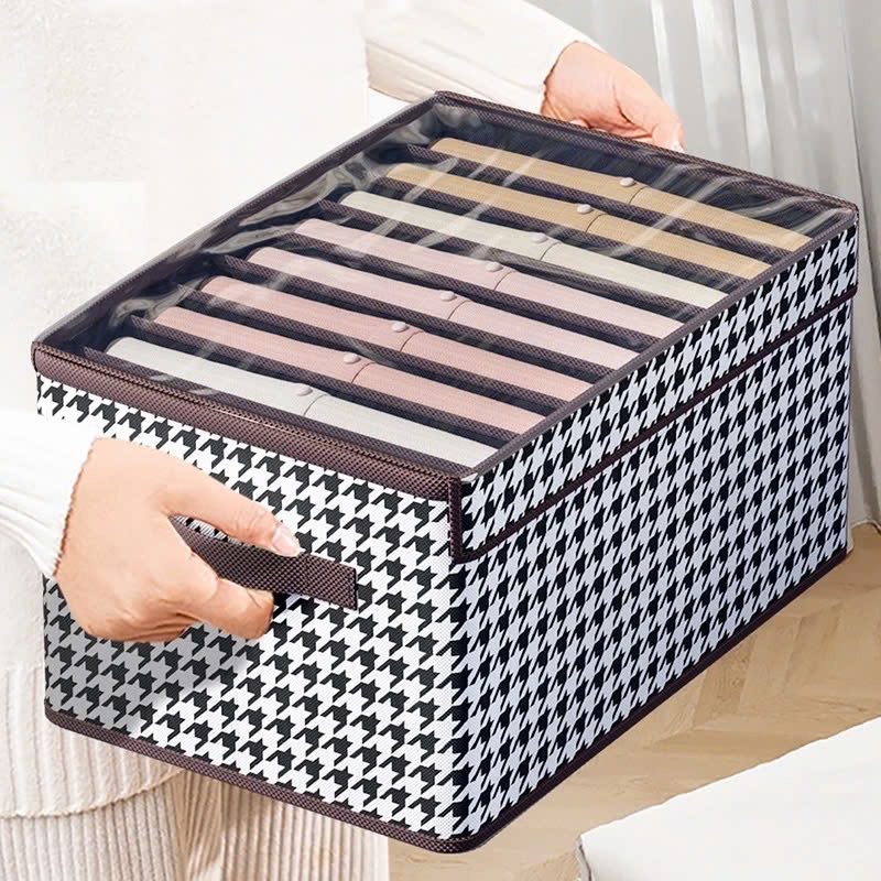 Với thiết kế 6 ngăn chia nhỏ, bạn có thể phân loại quần áo, đồ dùng cá nhân một cách ngăn nắp, đồng thời bảo vệ đồ đạc khỏi bụi bẩn và các yếu tố bên ngoài. Hộp vải này cũng được trang bị nắp đậy trong suốt, giúp bạn dễ dàng nhận diện và lấy đồ mà không cần phải mở hộp.