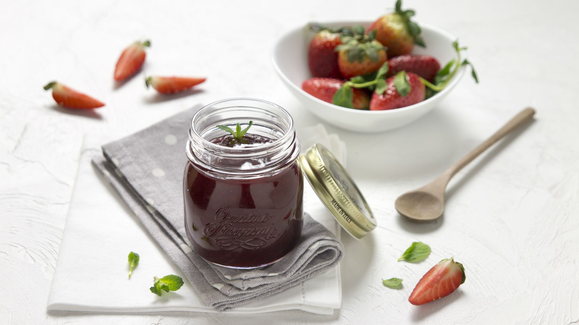 Nắp đậy màu vàng đồng nổi bật có in logo thiết kế dạng xoay giúp đậy kín và cách ly thực phẩm khỏi bụi bẩn. Phần thân chai cách điệu với logo Quattro Stagioni in nổi vừa đẹp mắt vừa có công dụng chống trơn trượt và làm nổi bật sự tinh tế của chất liệu thủy tinh.