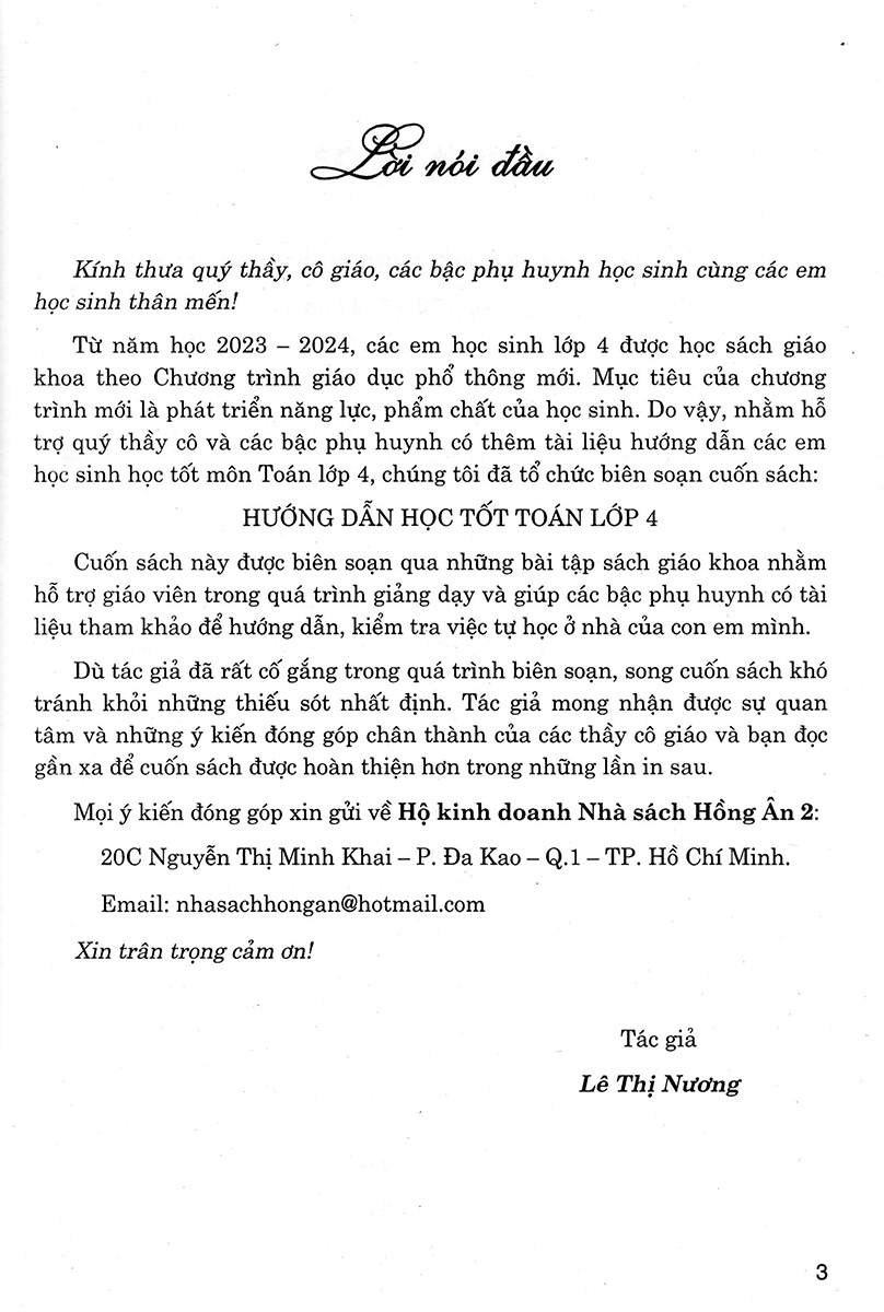Từ năm học 2023 – 2024, các em học sinh lớp 4 được học sách giáo khoa theo Chương trình giáo dục phổ thông mới. Mục tiêu của chương trình mới là phát triển năng lực, phẩm chất của học sinh. Do vậy, nhằm hỗ trợ quý thầy cô và các bậc phụ huynh có thêm tài liệu hướng dẫn các em học sinh học tốt môn Toán lớp 4, chúng tôi đã tổ chức biên soạn cuốn sách: