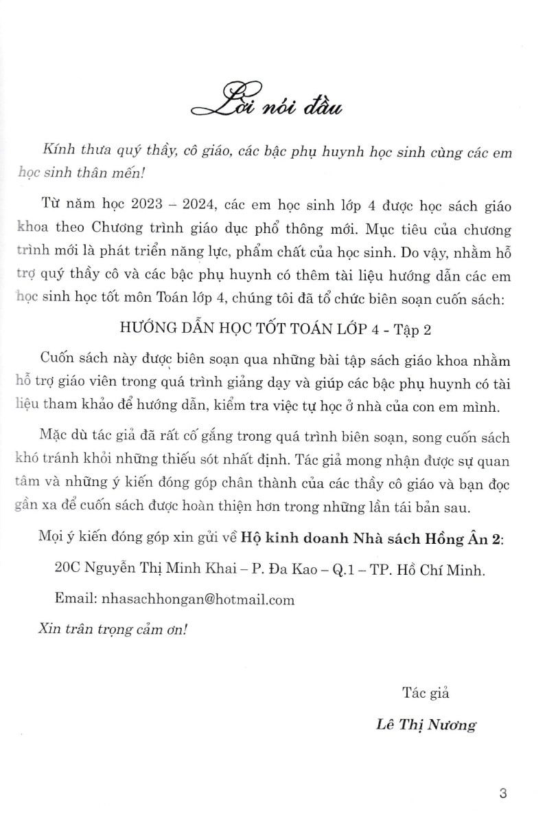 Từ năm học 2023 – 2024, các em học sinh lớp 4 được học sách giáo khoa theo Chương trình giáo dục phổ thông mới. Mục tiêu của chương trình mới là phát triển năng lực, phẩm chất của học sinh. Do vậy, nhằm hỗ trợ quý thầy cô và các bậc phụ huynh có thêm tài liệu hướng dẫn các em học sinh học tốt môn Toán lớp 4, chúng tôi đã tổ chức biên soạn cuốn sách: