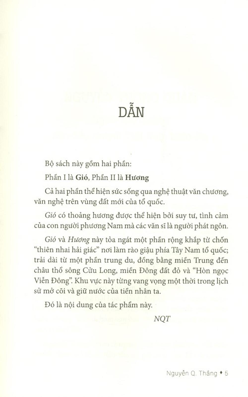 Tập sách này là một phần rất nhỏ - nếu không muốn là gợn sóng của các công trình về sử học, văn học Việt Nam từ thế kỉ XVI đến giữa thế kỉ XX trong tiến trình văn hóa, văn học nước nhà. Nhưng vì các bộ sách vừa kể khá dày, nên ở đây chúng tôi tổng hợp, rút, tỉa các chi tiết mà người viết gọi là Gió có thoảng Hương được thể hiện bởi suy tư, tình cảm của các văn thi sĩ, nhà văn của đất phương Nam.