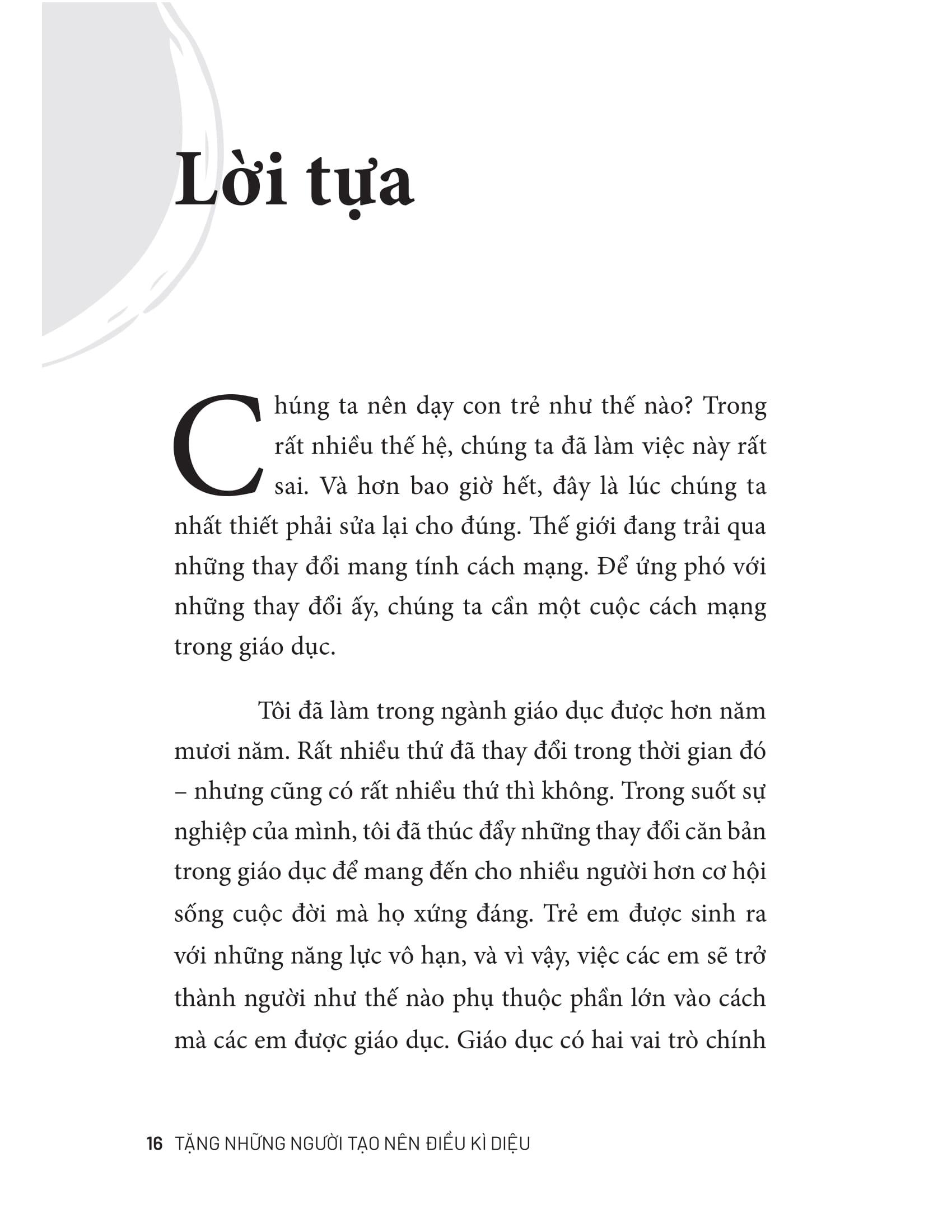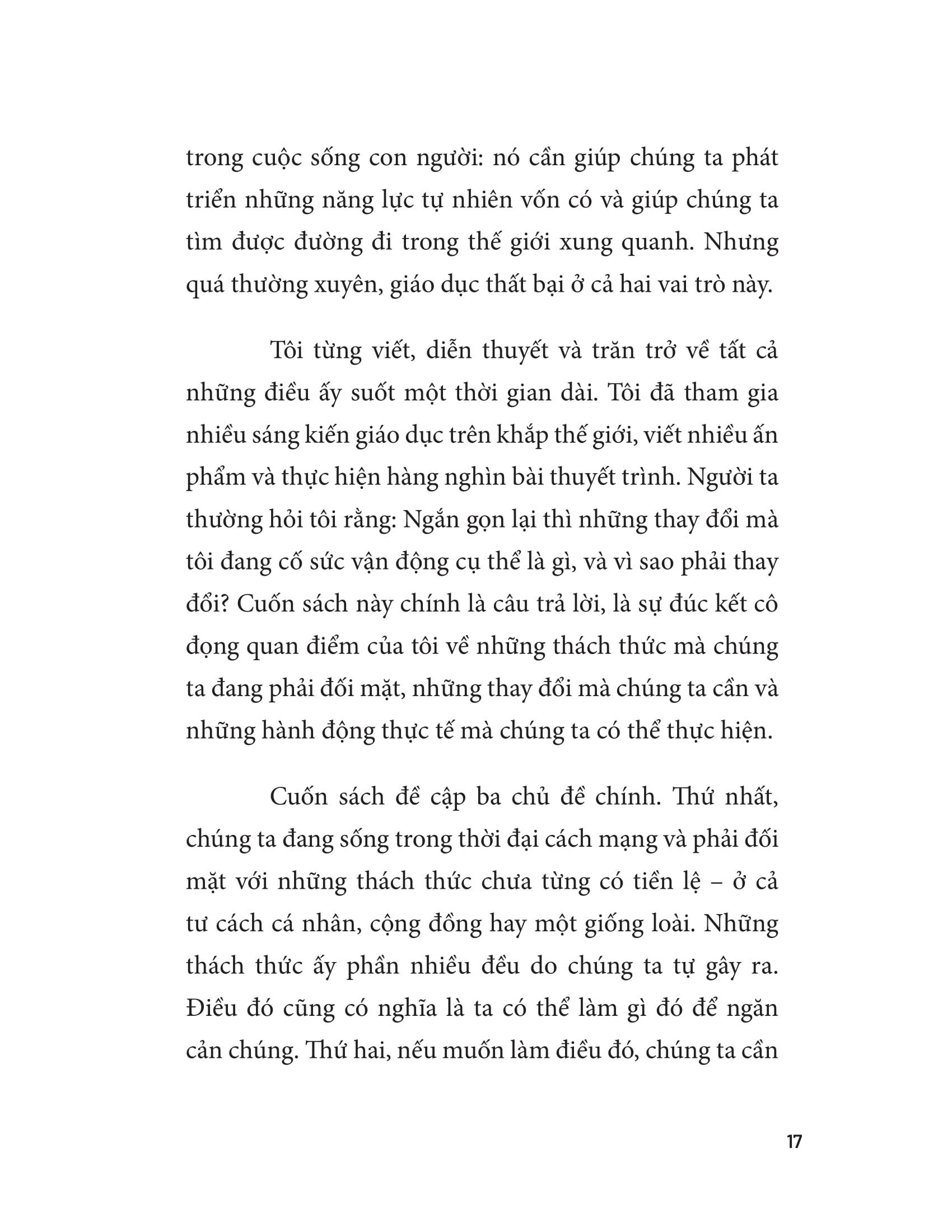 Cuốn sách là cái nhìn sâu và thấu đáo về những điều thật sự cần cho một nền giáo dục tiến bộ - một cuốn sách cần thiết cho các bậc cha mẹ, thầy cô và các nhà hoạch định chính sách, những người quan tâm đến giáo dục và thật sự mong muốn tạo ra những thay đổi tích cực để kiến tạo một tương lai tốt đẹp hơn cho tất cả.