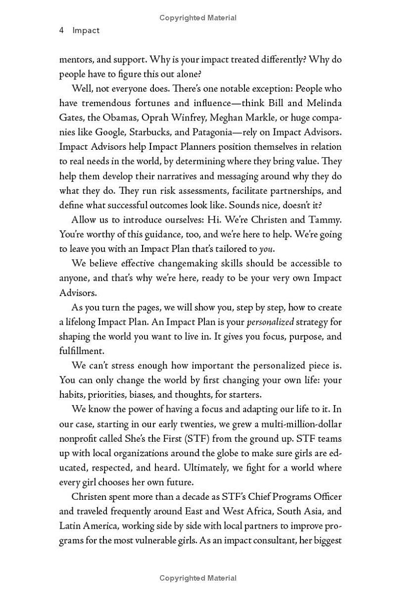 Impact brings you the answers. Drawing on their network and experience as founders of She's the First, Christen Brandt and Tammy Tibbetts show you how to create your own impact strategy, one that fits into your life and allows you to match what you have with what the world needs.