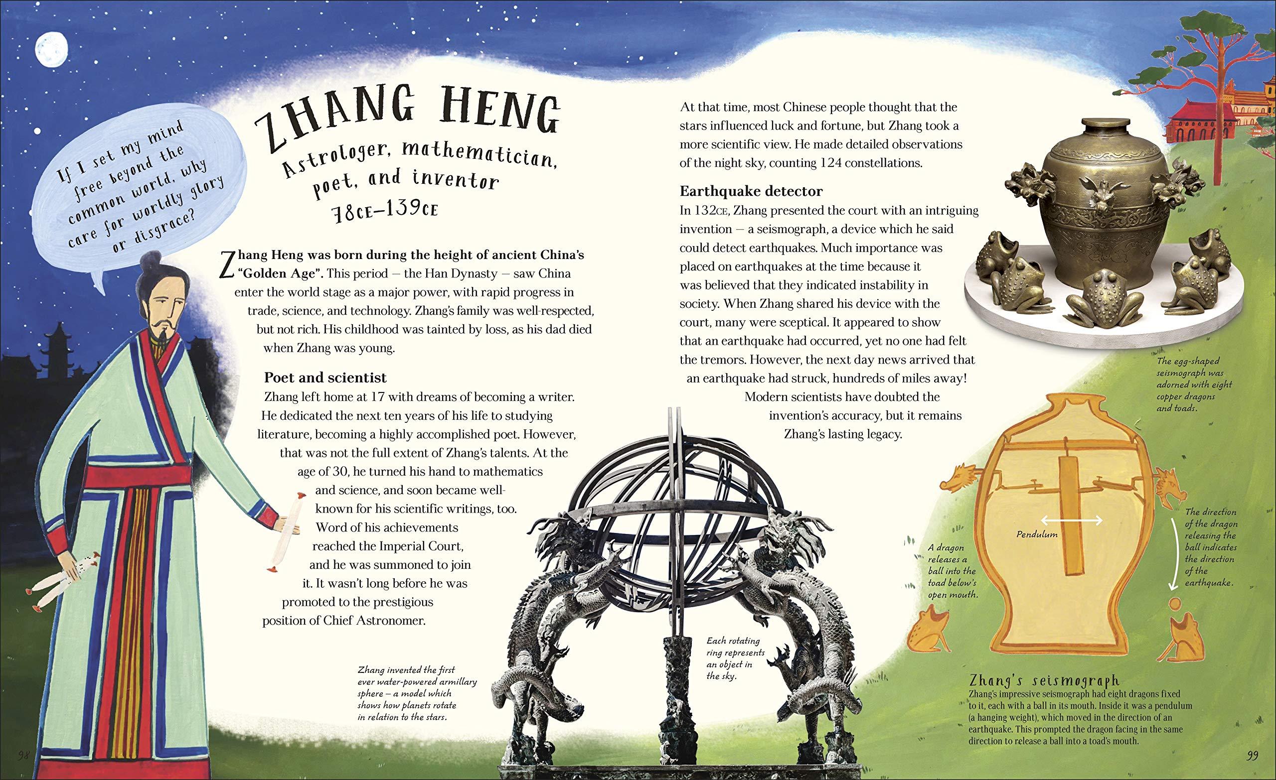 Step into Leonardo da Vinci's workshop, relax on board Hideo Shima's speedy bullet train, and join movie star Hedy Lamarr to bounce ideas around in between takes. Inventors looks at the towering achievements of more than 50 inventors in great detail. The stories are as unusual as they are unique. From Mr. Kellogg, who accidentally created cornflakes after leaving grains boiling for too long, to the ancient Turkish polymath Ismail al-Jazari, who decided the best way to power a clock was with a model elephant, to Sarah E. Goode's fold-up bed space-saving solution--the inventors of this book have all used tons of creativity to find ways to improve our world. These groundbreaking inventions include the very earliest discoveries to modern-day breakthroughs in science, food, transportation, technology, toys, and more.