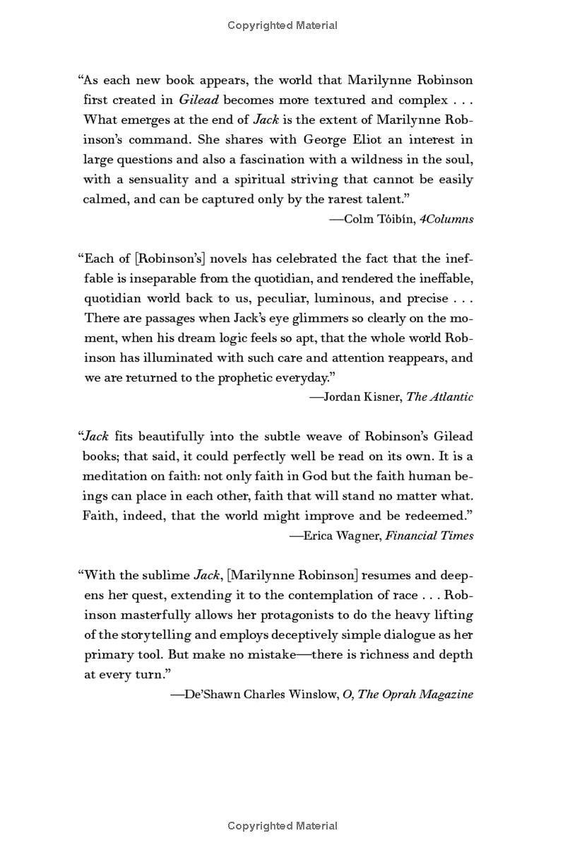 Jack is Robinson’s fourth novel in this now-classic series. In it, Robinson tells the story of John Ames Boughton, the prodigal son of Gilead’s Presbyterian minister, and his romance with Della Miles, a high school teacher who is also the child of a preacher. Their deeply felt, tormented, star-crossed interracial romance resonates with all the paradoxes of American life, then and now.