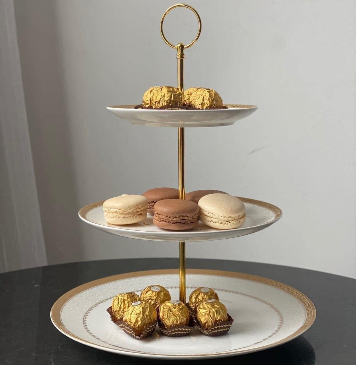 • Thiết kế hoa văn đồng bộ: Kệ bánh 3 tầng với viền vàng tinh tế, lý tưởng để trưng bày bánh ngọt, trái cây trong các buổi tiệc trà.