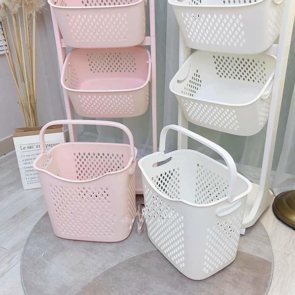 - Kệ gồm 3 tầng, mỗi tàng là 1 chiếc giỏ đựng, riêng giỏ bự nhất ở ngăn cuối có quai xách khi tháo rời có thể dùng làm giỏ đựng đồ tiện lợi.
