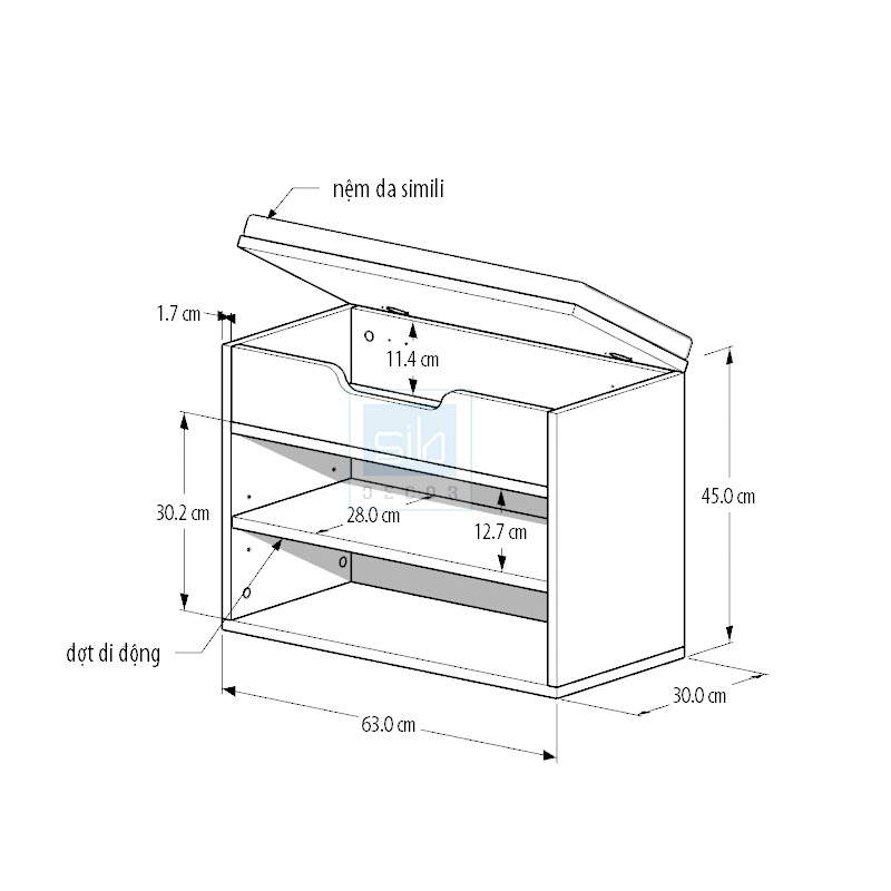 - Kệ gỗ được thiết kế đơn giản: gồm 2 ngăn hở để giày, phần đệm ghế ngồi êm ái sang trọng, phần dưới đệm có ngăn đóng/mở vô cùng tiện lợi, tạo thêm một khu vực nhỏ để lưu trữ đồ đạc.