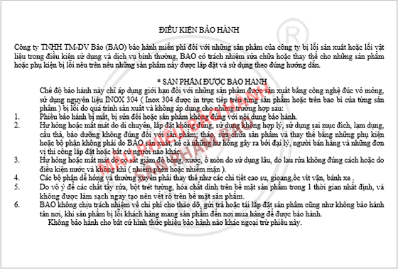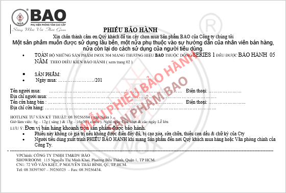 Sản phẩm được bảo hành trọn đời với phiếu bảo hành kèm theo, chế độ bảo hành chu đáo.