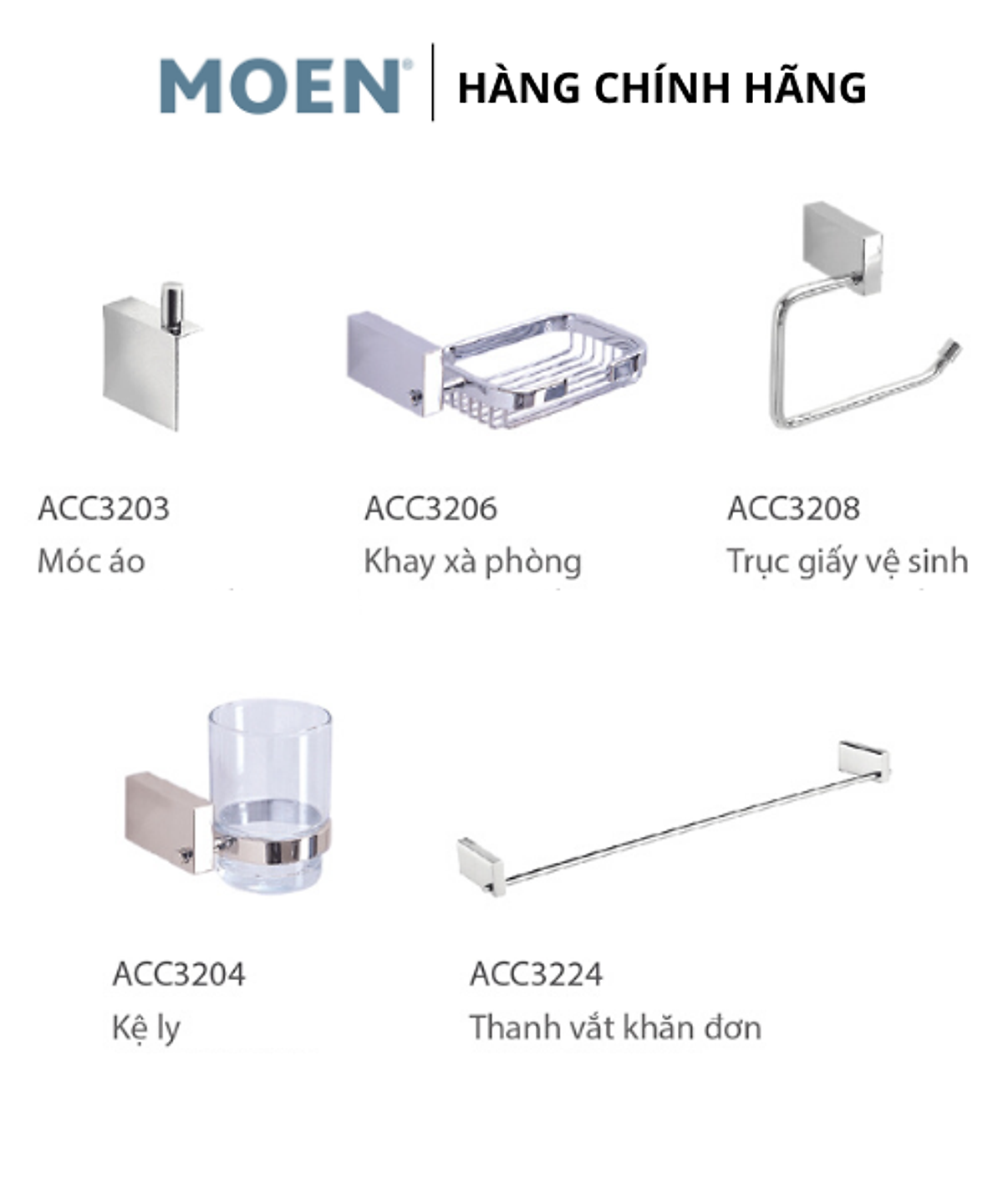 - Sản phẩm mang đến cho những người đam mê phong cách hiện đại , làm nổi bật tăng tính thẩm mỹ cho nhà tắm của họ. Các sản phẩm khác trong dòng NOUMEA Thanh vắt khăn đơn MOEN ACC3224 Trục giấy vệ sinh MOEN ACC3208 Khay xà phòng MOEN ACC3206 Kệ ly MOEN ACC3204 Móc áo MOEN ACC3203 Thanh vắt khăn đôi MOEN ACC3226 Thông tin thương hiệu MOEN