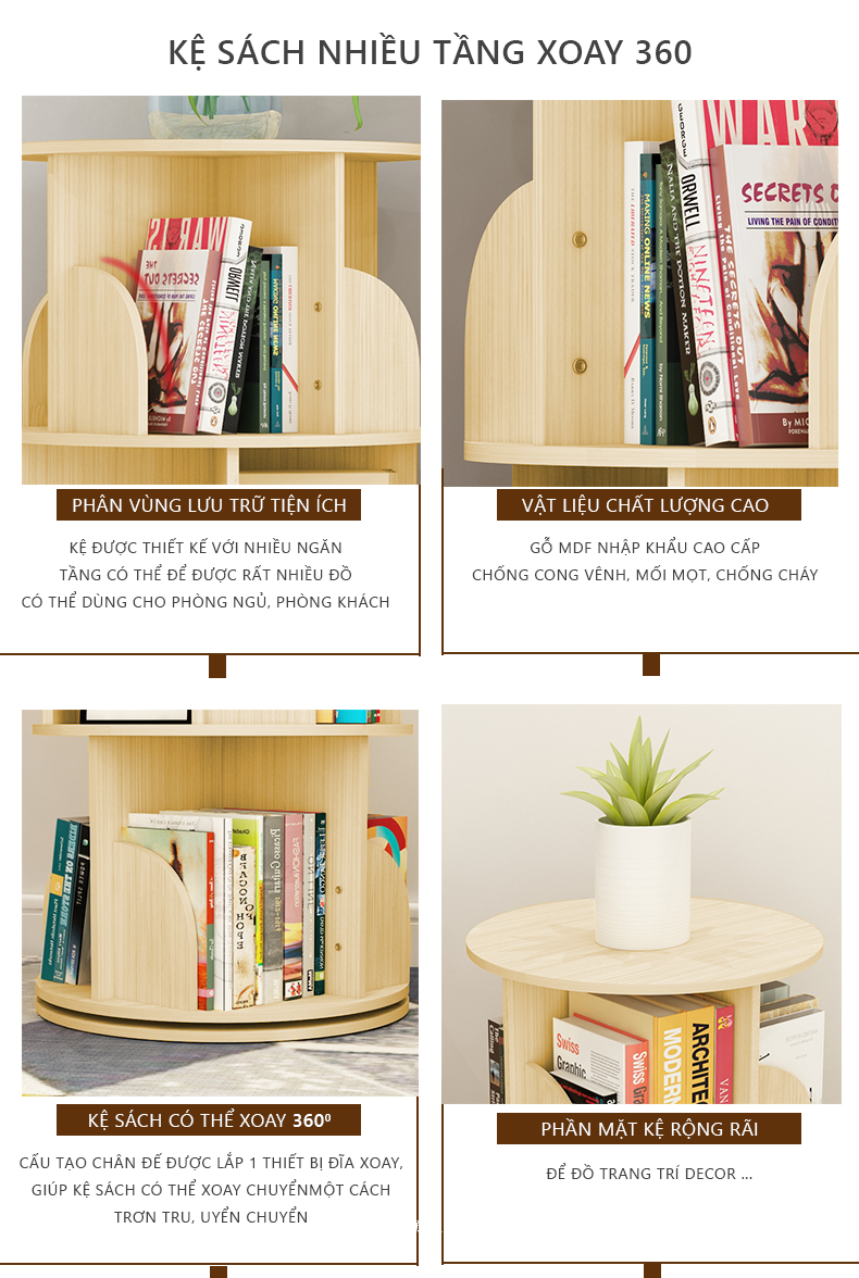 Tên sản phẩm: Kệ Sách Xoay Màu sắc: Màu Vân Gỗ Kích thước: Chiều Cao 125cm - Chiều Ngang 46cm Chất liệu: Gỗ Công Nghiệp (Gỗ MDF) nhập khẩu Bề mặt: Phủ lớp Melamine dày dặn Dán chỉ cạnh: Có