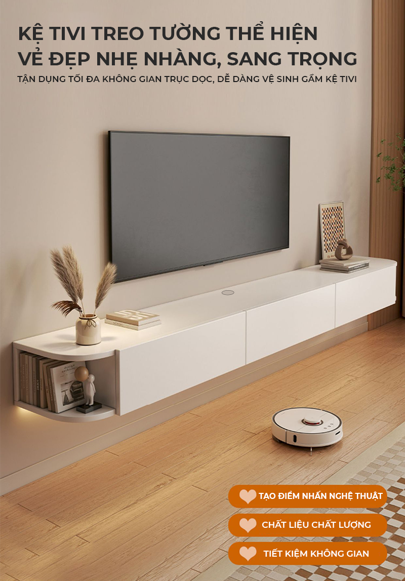 Công năng: Là mẫu kệ tivi có thiết kế hiện đại và đẹp mắt treo tường giúp không gian phòng rộng hơn.