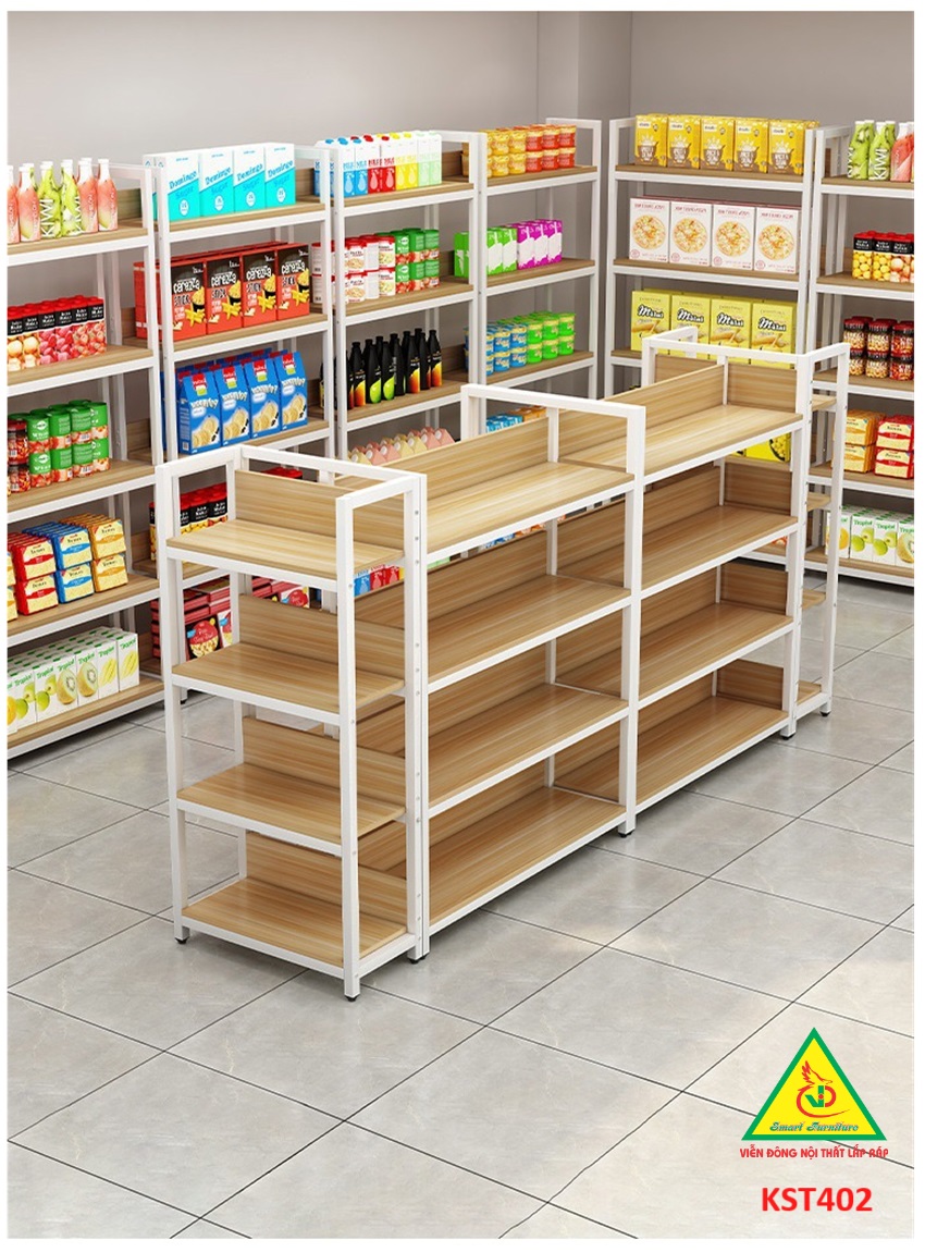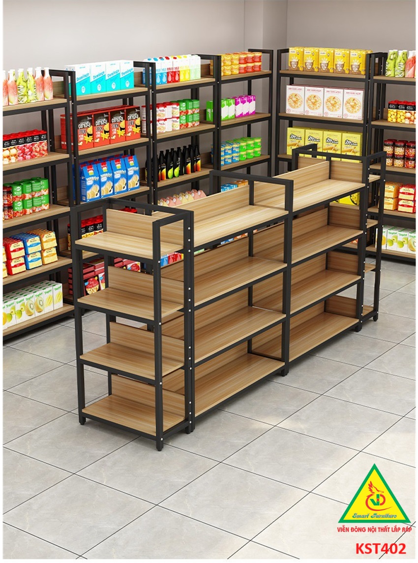 Kệ khung sắt mặt gỗ là một một loại kệ trưng bày hoặc để hàng hóa sản phẩm. Tuy nhiên, thay vì sử dụng mâm tole , thì các mẫu kệ này sẽ được sử dụng chất liệu gỗ MDF để làm mâm chứa hàng, kết hợp với khung sắt chắc chắn, thì mẫu kệ này là loại kệ để được rất nhiều loại đồ, và ứng dụng được trong rất nhiều nhu cầu của khách hàng như chứa đồ, trang trí, bán hàng…