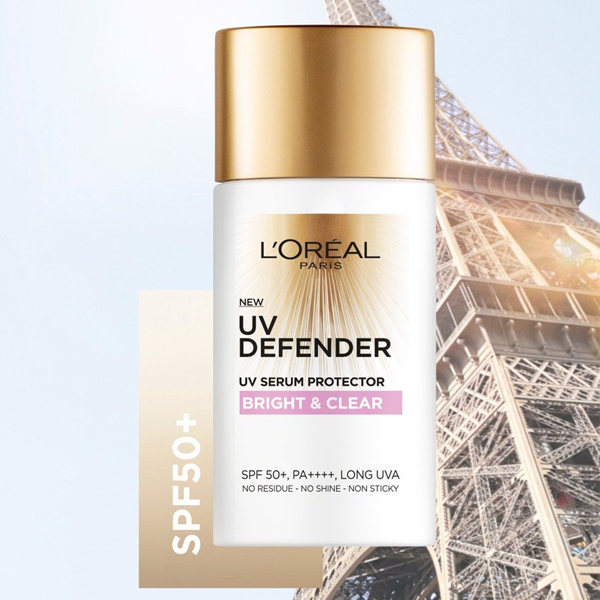 - Tinh chất chống nắng L&rsquoOréal Paris UV Defender SPF50+ PA++++ Bright & Clear giúp bảo vệ da trước tác hại của ánh nắng mặt trời, che khuyết điểm trên da, với chỉ số chống nắng SPF50+ PA++++ Long UVA.