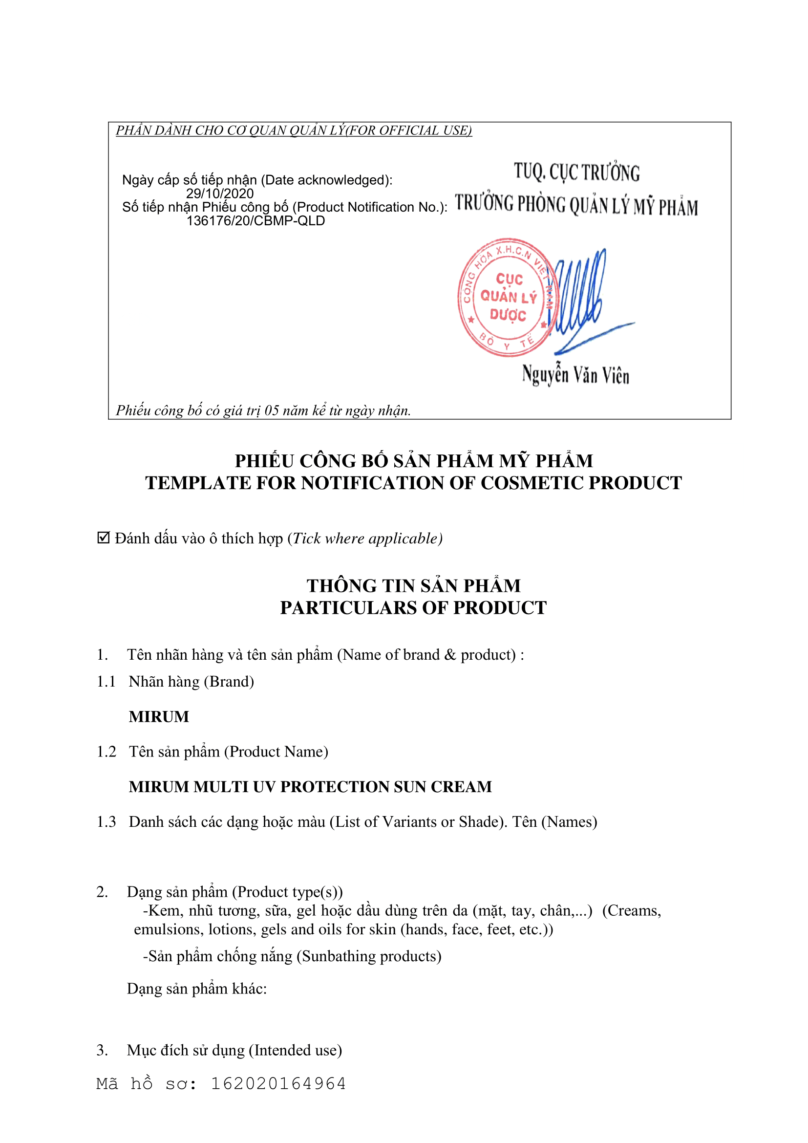 Kem chống nắng nâng tông, dưỡng trắng, ngừa lão hóa và bảo vệ da toàn diện Mirum 50ml – Mirum Multi UV Protection Sun Cream SPF 50+/PA+++ THÔNG TIN SẢN PHẨM Kem chống nắng nâng tông, dưỡng trắng, ngừa lão hoá và bảo vệ da toàn diện Mirum 50ml