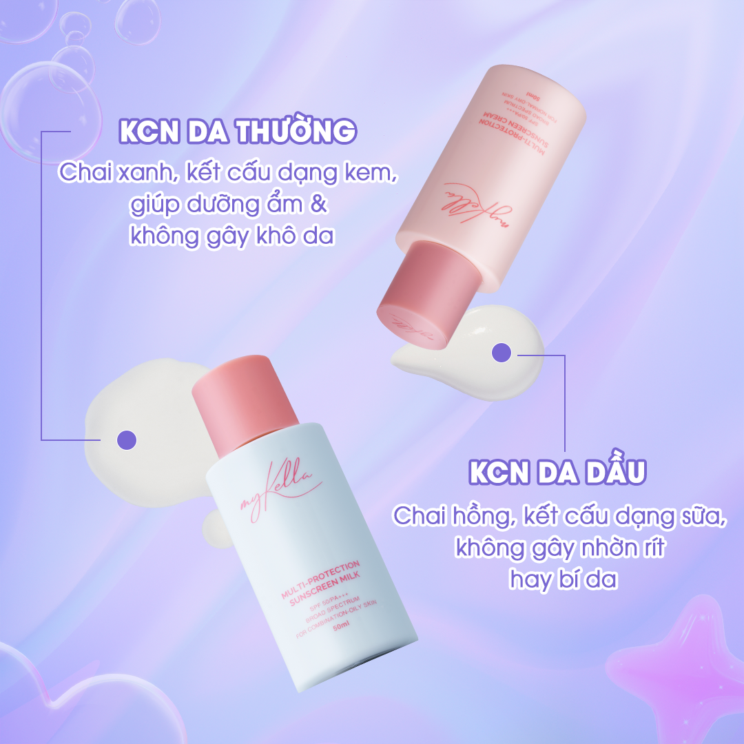 - Kem chống nắng myKella Multi Protection Sunscreen Milk là sản phẩm không thể thiếu trong quy trình chăm sóc da hàng ngày, giúp bảo vệ da khỏi tác hại của tia UV và môi trường, đồng thời cung cấp độ ẩm và dưỡng chất cần thiết cho làn da khỏe mạnh.