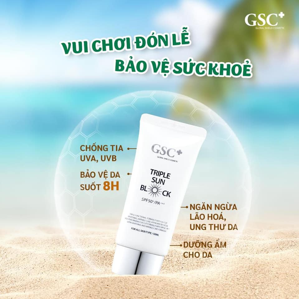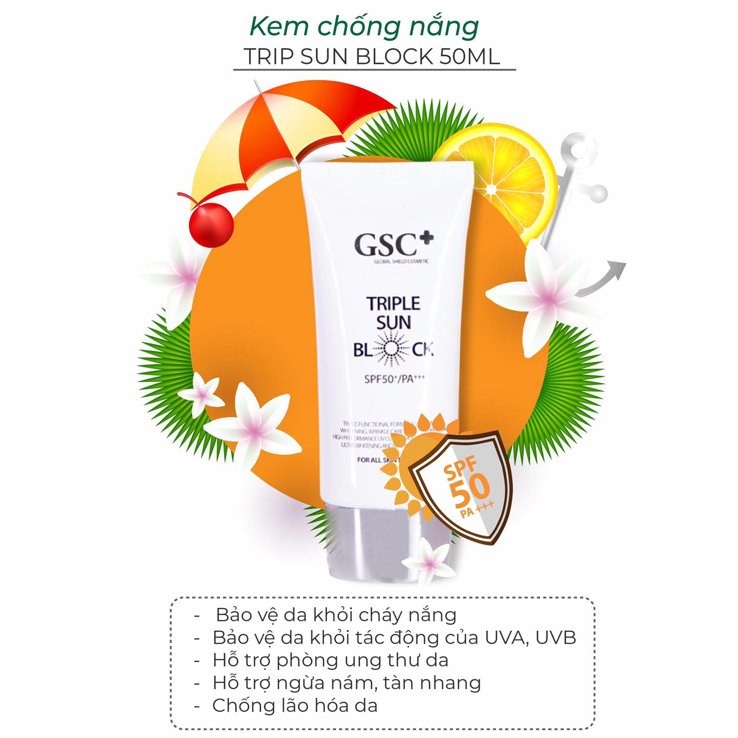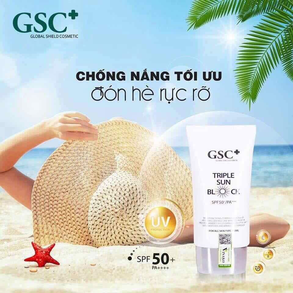 - TRIPLE SUN BLOCK 50g Kem chống nắng GSC Triple Sun Block Hàn Quốc là một trong những sản phẩm kem chống nắng vật lý. Sản phẩm được chị em phụ nữ tin dùng nhiều nhất tại Việt Nam. Kem chống nắng chứa thành phần lành tính và chỉ số chống nắng cao. Giúp bảo vệ làn da khỏi tác hại của các tia UVA/UVB, chống lão hóa. Phù hợp với mọi loại da, kể cả da nhạy cảm