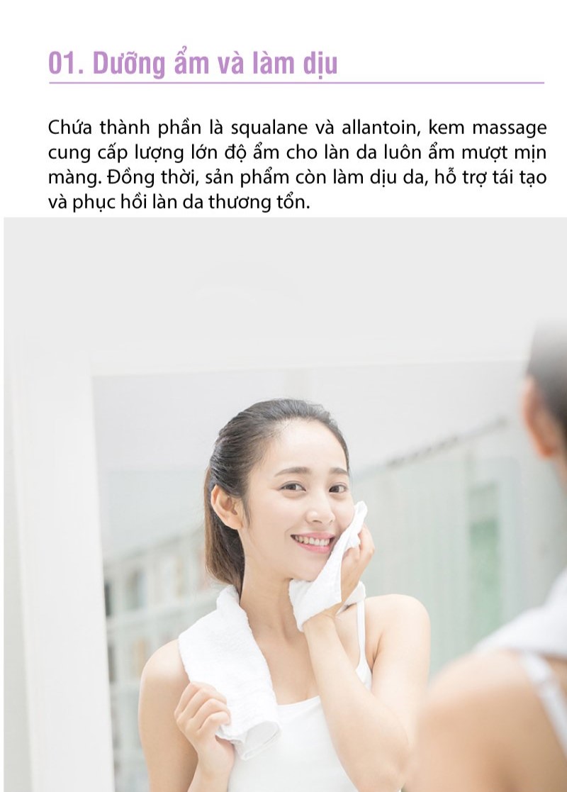 - Rửa sạch mặt và thấm khô. Lấy 1 lượng kem massage vừa đủ thoa lên da (trừ vùng mắt, miệng) và massage nhẹ nhàng.