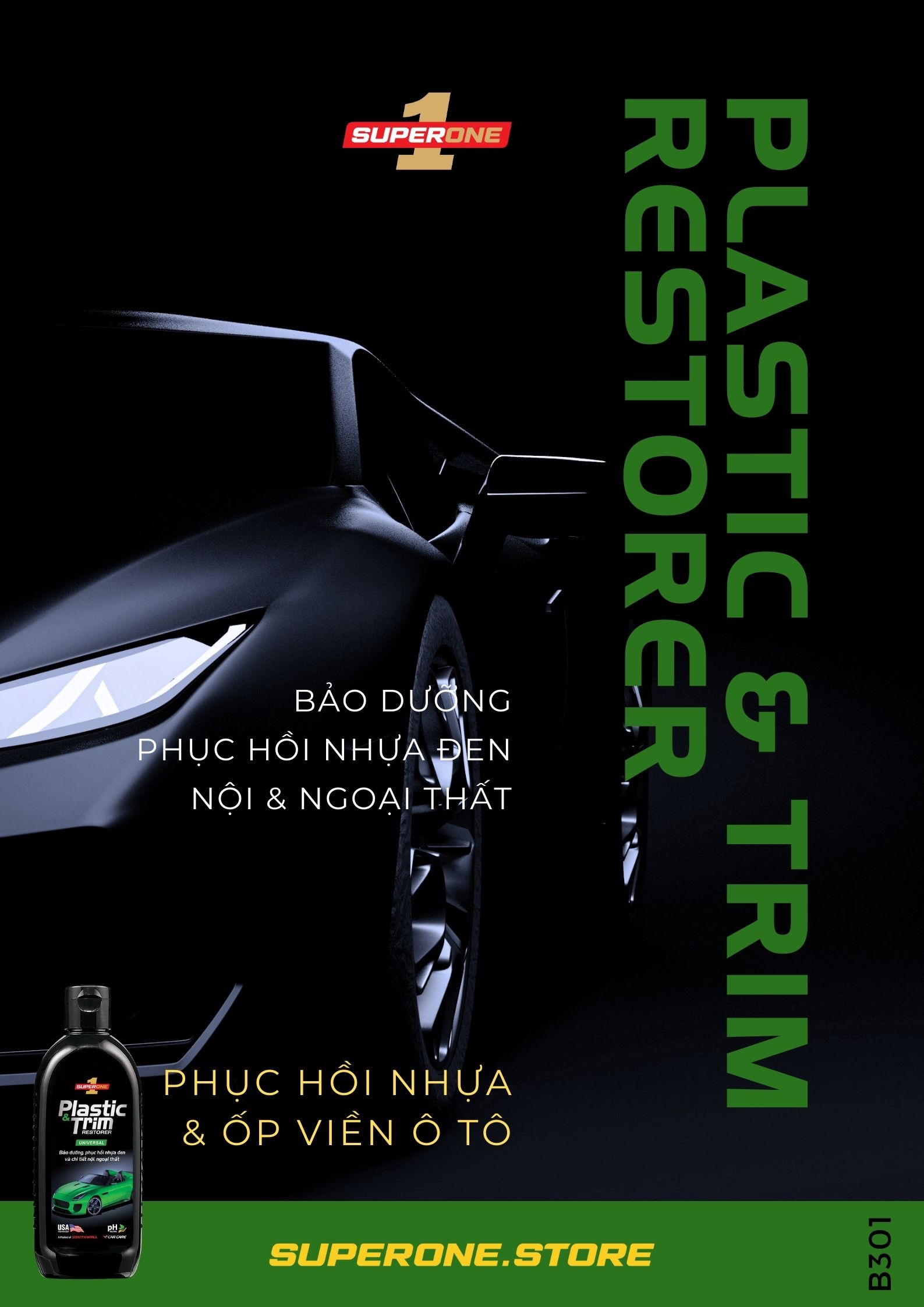 BẢO DƯỠNG, PHỤC HỒI NHỰA ĐEN NỘI, NGOẠI THẤT   Kem Phục Hồi Bảo Dưỡng Nhựa & Ốp Viền Ô Tô Super One Plastic & Trim Restorer - Universal, sản phẩm đa năng dành riêng cho nhựa, cao su và da tổng hợp trên xe ô tô của bạn. Sản phẩm này được công thức hóa để làm sạch, bảo vệ và phục hồi màu sắc tươi sáng của tất cả các thành phần nhựa, cao su và vinyl trên xe của bạn. Bảo quản các chi tiết bên trong như bảng điều khiển, taplo, cửa xe và ron viền, đồng thời làm mới các bề mặt nhựa không sơn. Công thức khô nhanh, không nhờn, kháng nước tốt và ngăn ngừa hiện tượng nhựa mất màu do tác động của tia UV. Sản phẩm còn giúp làm mờ nhẹ các vết trầy và loại bỏ các vết xỉn màu.   Đặc Tính Sản Phẩm