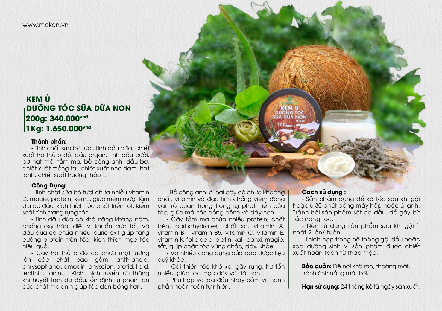 KEM Ủ TÓC SỮA DỪA NON MẸ KEN 200ml Thành phần: Tinh chất sữa bò tươi , tinh dầu dừa , chiết xuất hà thủ ô đỏ , dầu Argan , tinh dầu bưởi ,