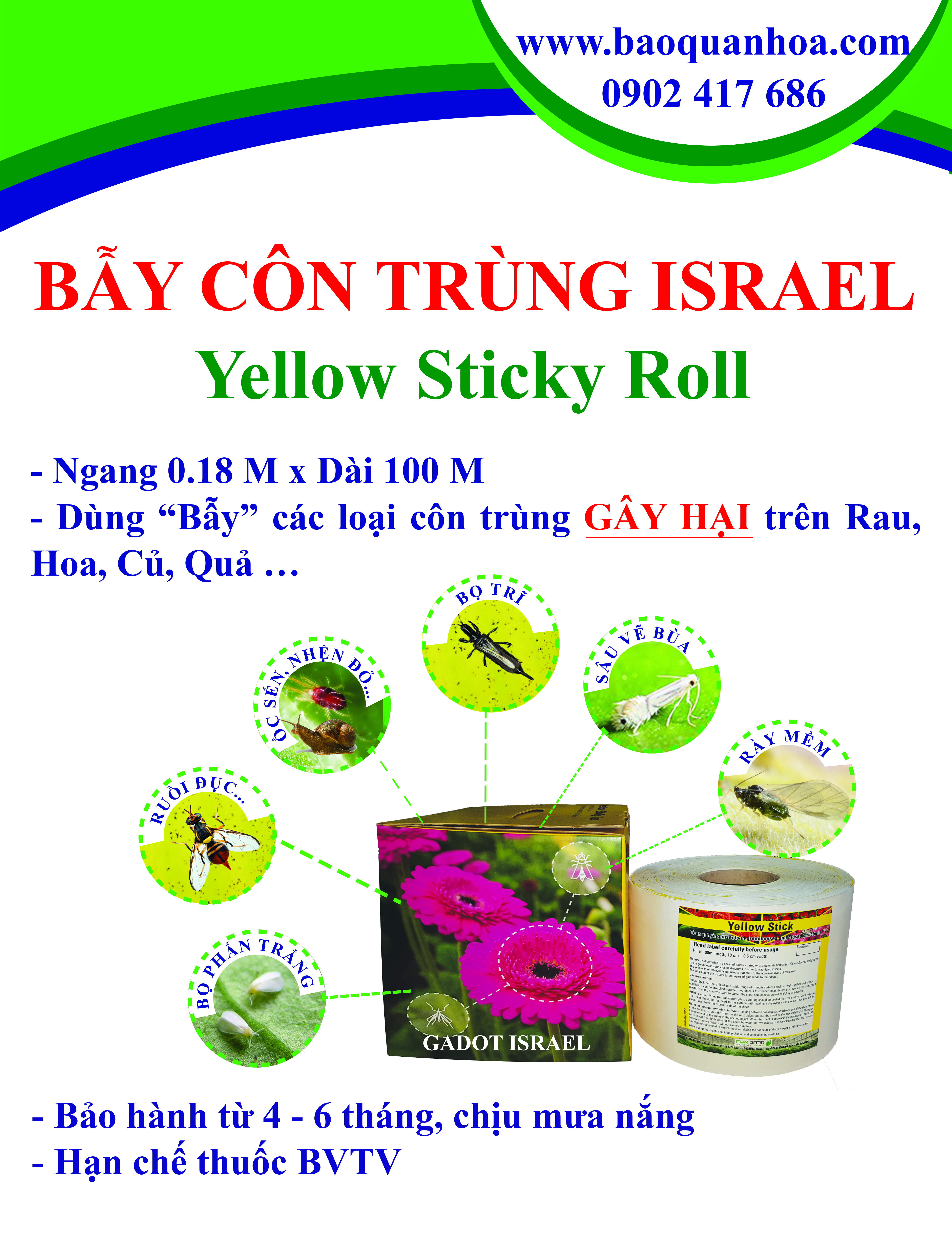 KEO VÀNG BẪY RUỒI SINH HỌC TRONG NÔNG NGHIỆP CỦA ISRAEL TẠI VIỆT NAM1. MÔ TẢ VÀ ƯU ĐIỂM CỦA KEO DÍNH CÔN TRÙNG NÔNG NGHIỆPKEO dính Bẫy Ruồi trong nông nghiệp của Israel là dạng cuộn màu vàng đặt t...