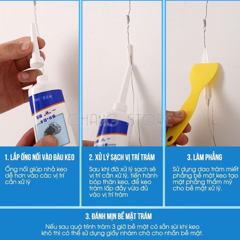 - Nếu vết nứt hoặc lỗ thủng quá lớn bạn nên gia cố bên trong trước rồi trát nhiều lớp keo và làm bằng với mặt phẳng tường CHÍNH SÁCH BÁN HÀNG Changstore cam kết sản phẩm giống hình, giống mô tả 100% Sản phẩm được kiểm tra kĩ càng, cẩn thận và tư vấn nhiệt tình trước khi gói hàng giao cho Quý Khách Hàng có sẵn, giao hàng ngay khi nhận được đơn Hoàn tiền nếu sản phẩm không giống với mô tả Giao hàng trên toàn quốc, nhận hàng trả tiền