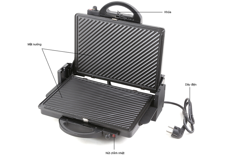 Khi mở ra 180 độ bạn có thể sử dụng như 1 chiếc vỉ nướng điện thông thường, với 2 bên khay nướng với 2 nút điều chỉnh nhiệt độ khác nhau. Hoặc bạn cũng có thể sử dụng như 1 chiếc máy nướng bánh Sandwich, hoặc nướng cá thịt.