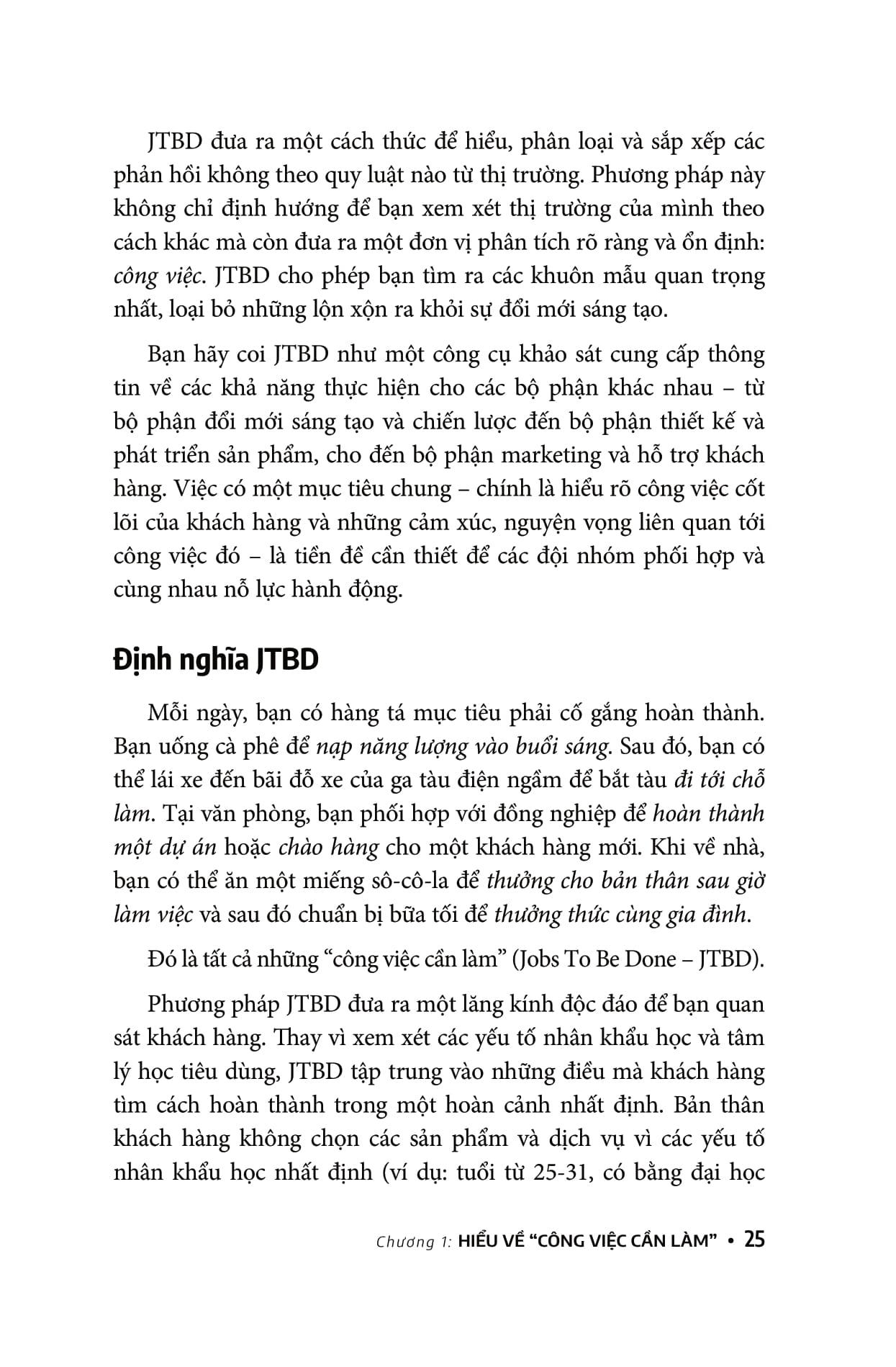 Đây là cuốn sách nhập môn hướng dẫn cho bạn về “Job to Be done” (hay JTBD), một lý thuyết đã được nghiên cứu gần 30 năm. Cuốn sách tập hợp các phương pháp đang được thực hành hiện nay mà tác giả Jim Kalbach gọi là “các chiến thuật”, mượn cách nói ẩn dụ “sổ tay chiến thuật” trong thể thao. Về cơ bản, chiến thuật là các kỹ thuật riêng lẻ tạo nền tảng để thực hiện JTBD.