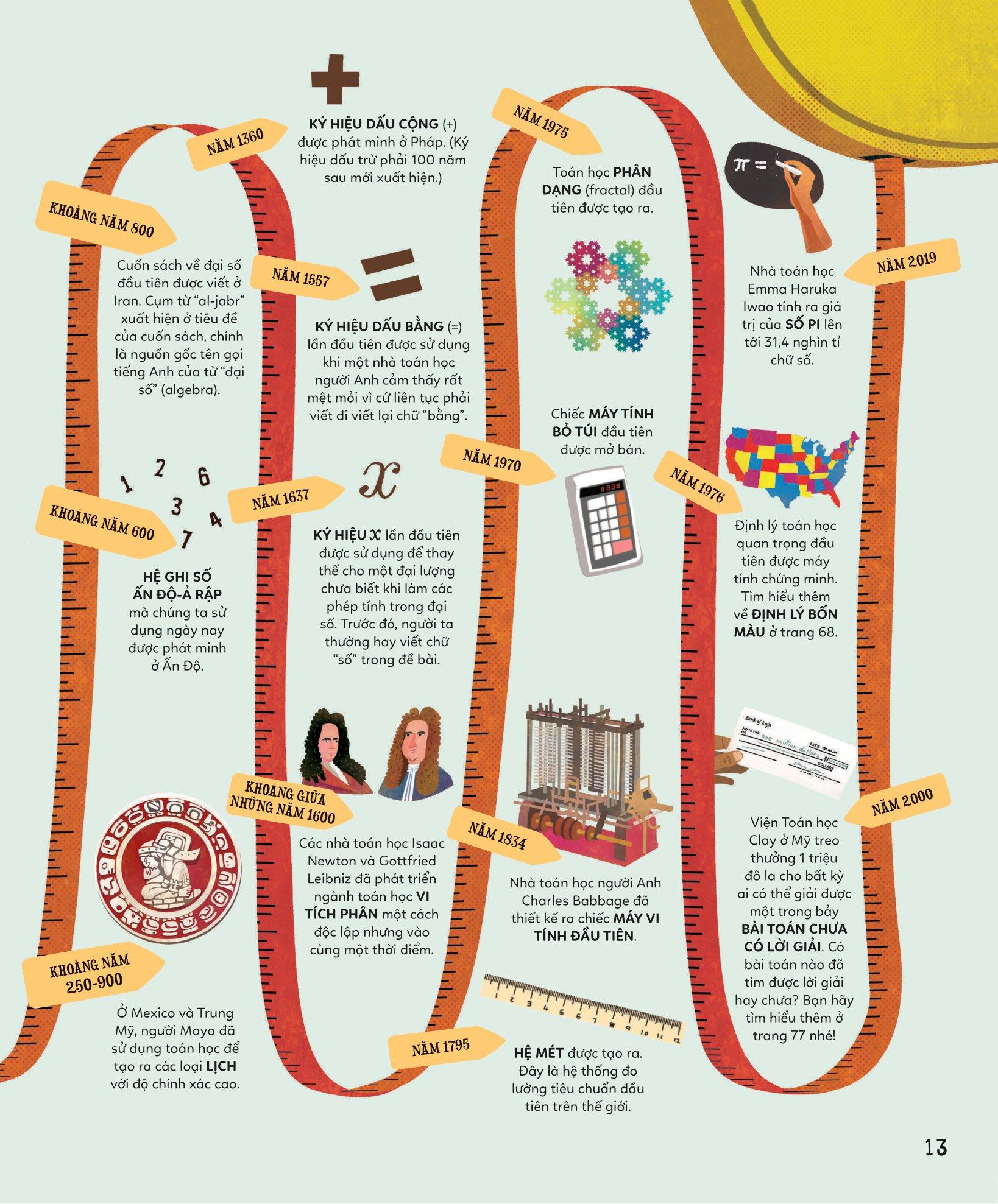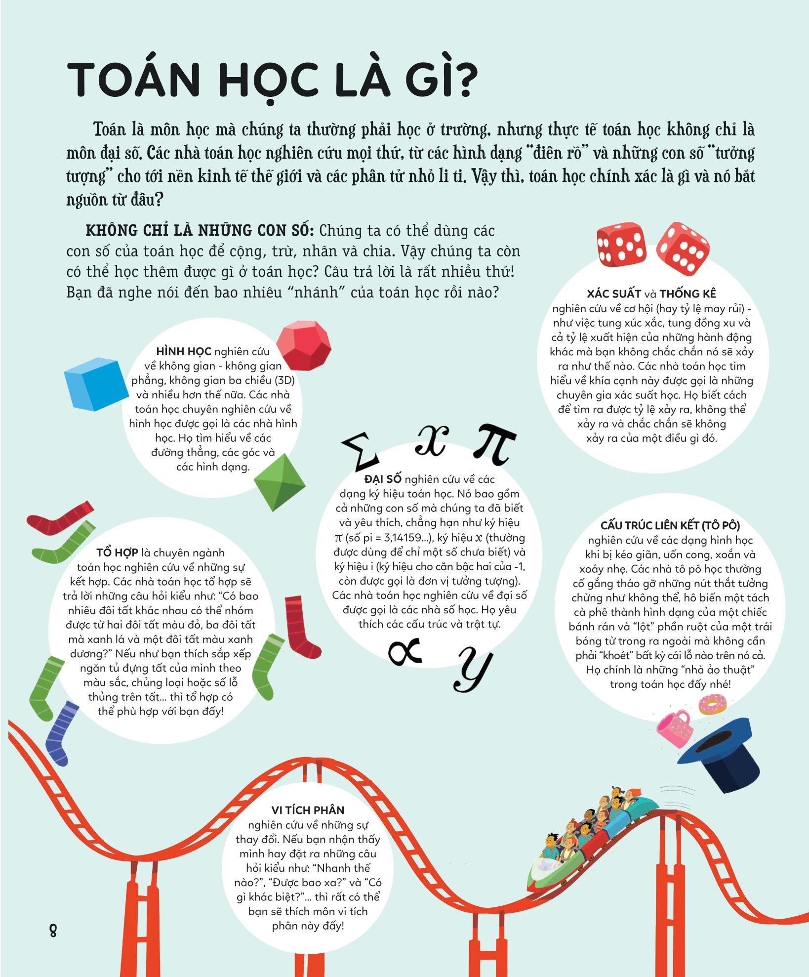 Khám Phá Toán Học Thú Vị Quanh Ta Với cuốn sách này, bạn sẽ đi từ bất ngờ này đến bất ngờ khác trên hành trình khám phá những điều thú vị về toán học, hàng trăm sự thật tuyệt vời và không kém phần kỳ lạ về toán học sẽ được hé lộ thông qua gần 100 trang sách. Toán học bắt nguồn từ đâu? Động vật có biết đếm không nhỉ? Định lý bánh mỳ giăm bông là gì thế? Tại sao số 0 lại là số hữu ích nhất trong tất cả các số? Toán học có thể giúp bạn giành chiến thắng trong các trò chơi như thế nào? Bạn đã sẵn sàng tìm kiếm câu trả lời cho những câu hỏi này chưa?