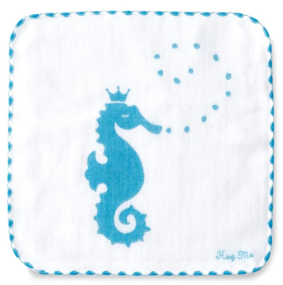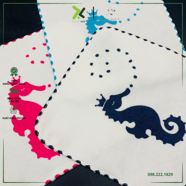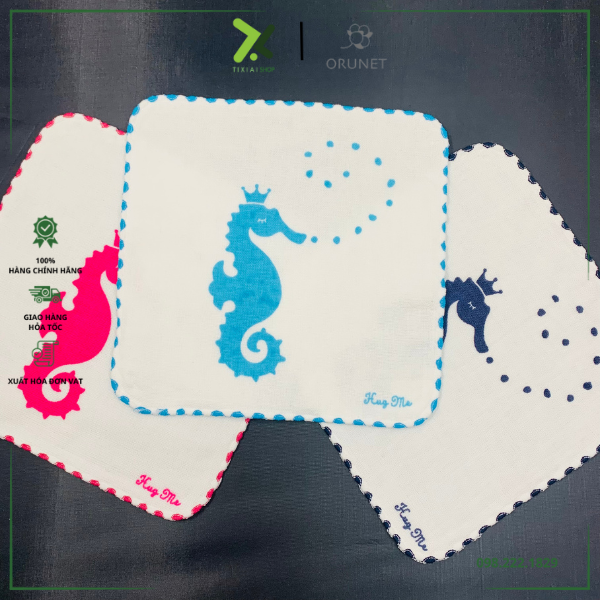 Họa tiết là hình con cá ngựa xinh xắn với bề mặt với họa tiết là gạc và mặt sau là vải cọc nên chiếc khăn này tuy mỏng nhưng có khả năng thấm hút cao.