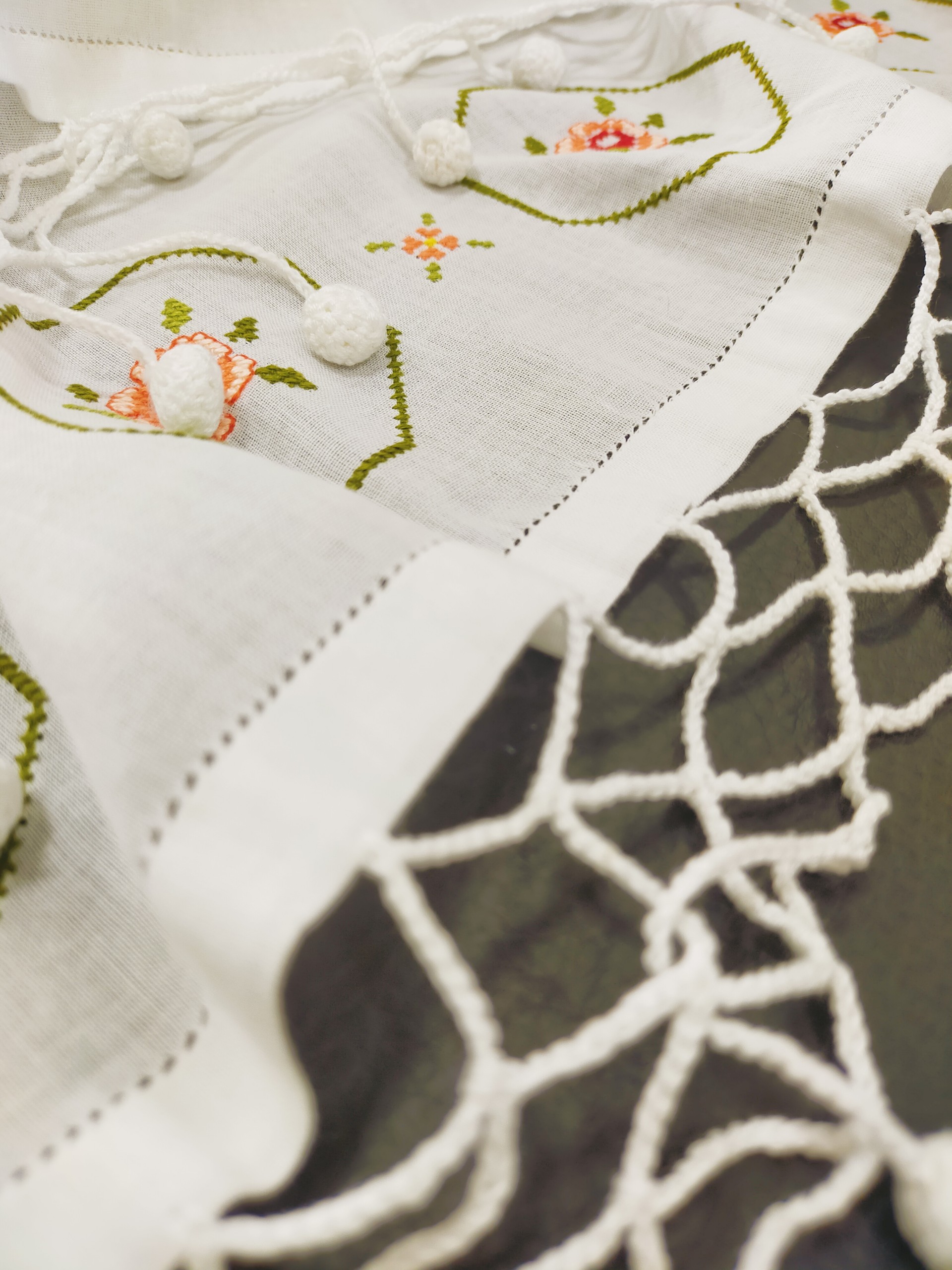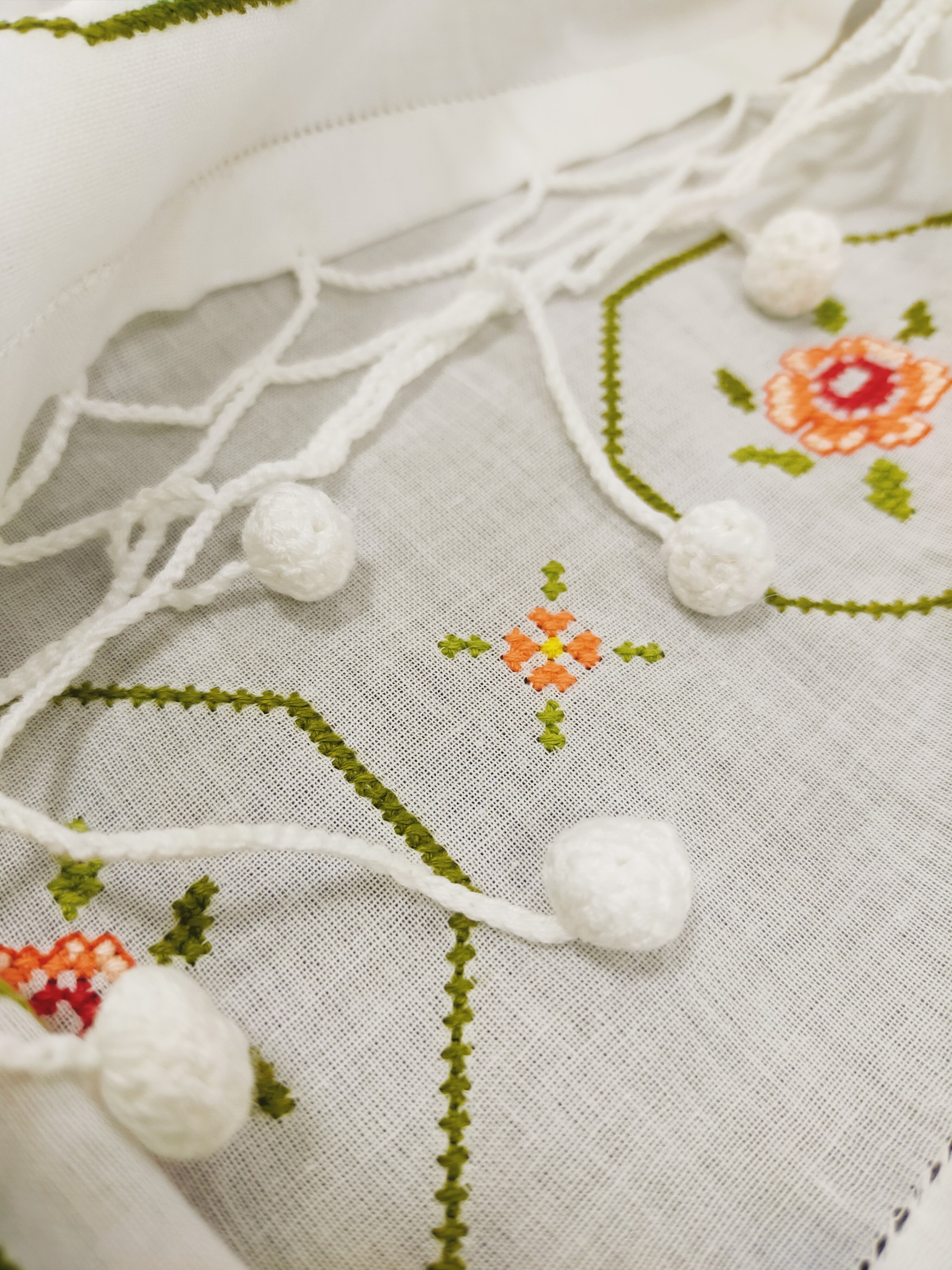 Để có một chiếc khăn mat’ra, người con gái Chăm phải rất kỳ công. Trước tiên, họ cắt một tấm lụa dài và bỏ thời gian ngồi thêu họa tiết. Nếu phải kết cườm thì còn phải tỉ mẩn hơn nữa. Bởi vậy, mỗi sản phẩm làm ra đều là sự kết tinh từ đôi bàn tay khéo léo và sự sáng tạo thẩm mỹ của người thêu.