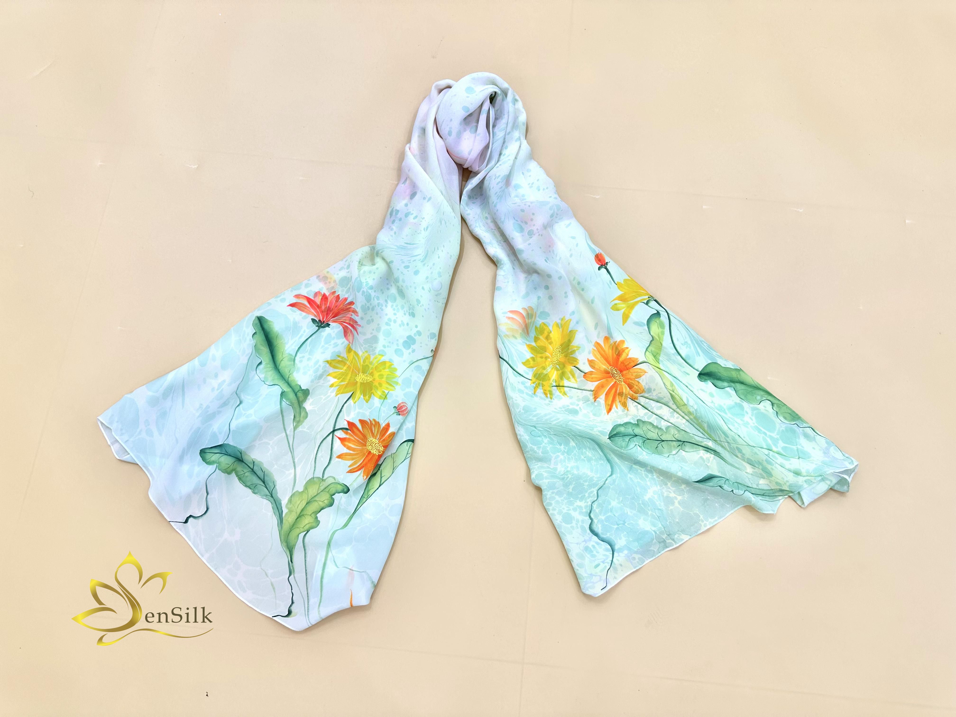 ✨Khăn Thuỷ Ấn Vẽ Tay SenSilk Hoa Đồng Tiền - Silk Shawl Water Marbled Hand Painted - Quà Tặng Đối Tác - Vietnam Silk Gift